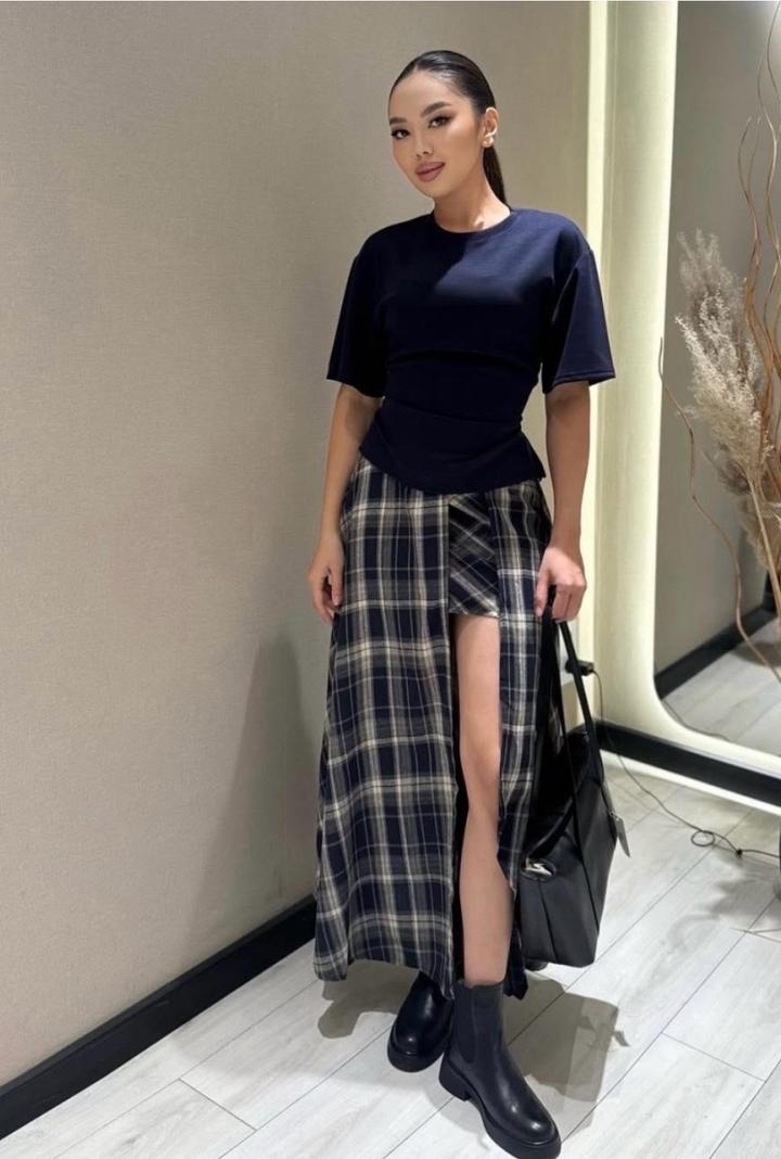 Костюм-двойка состоит из базовой футболки приталенного кроя и дизайнерской юбки-макси в трендовую клетку. Главная фишка образа — глубокий эффектный разрез на юбке, который кокетливо открывает ноги при движении, добавляя образу динамики и легкости. Артикул: 477349