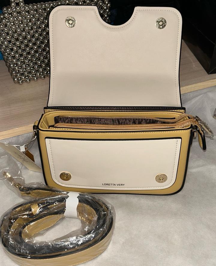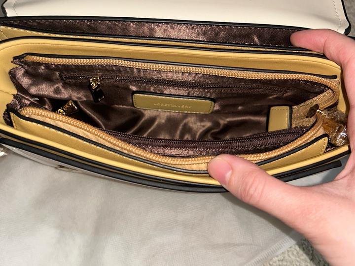 Новая, 22.5х15х6см. Внутри 2 больших отсека, и три маленькие карманы (2 с замком), сзади тоже кармашек без замка. Фурнитура золотистая. Ремешок (ширина: 3,5 см, длинная). Артикул: 477407