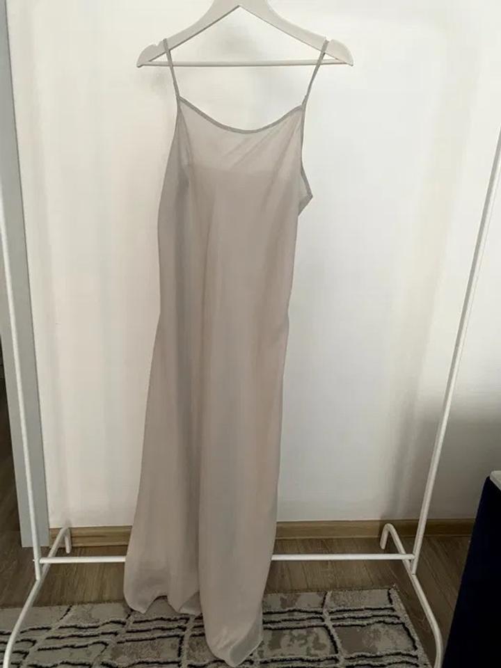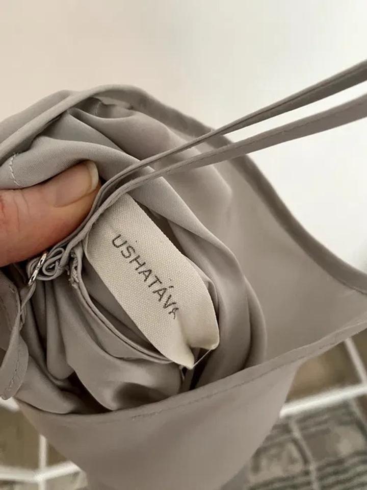 Продаю элегантное платье-комбинацию миди Ushatava (оригинал, серо-бежевое/пыльно-серое) — на тонких регулируемых бретелях, струящаяся ткань, идеально для layering или как вечернее/домашнее! Характеристики: — Крой: slip dress миди (прямой/облегающий, длина до щиколоток) — Бретели: тонкие спагетти с регулировкой (кольцо/люверс) — Материал: шёлк/атлас/вискоза (лёгкая, матовая, приятная к телу) — Цвет: серо-бежевый/пыльно-серый (универсальный, идёт почти ко всему) — Состояние: почти новое — надева Артикул: 477795
