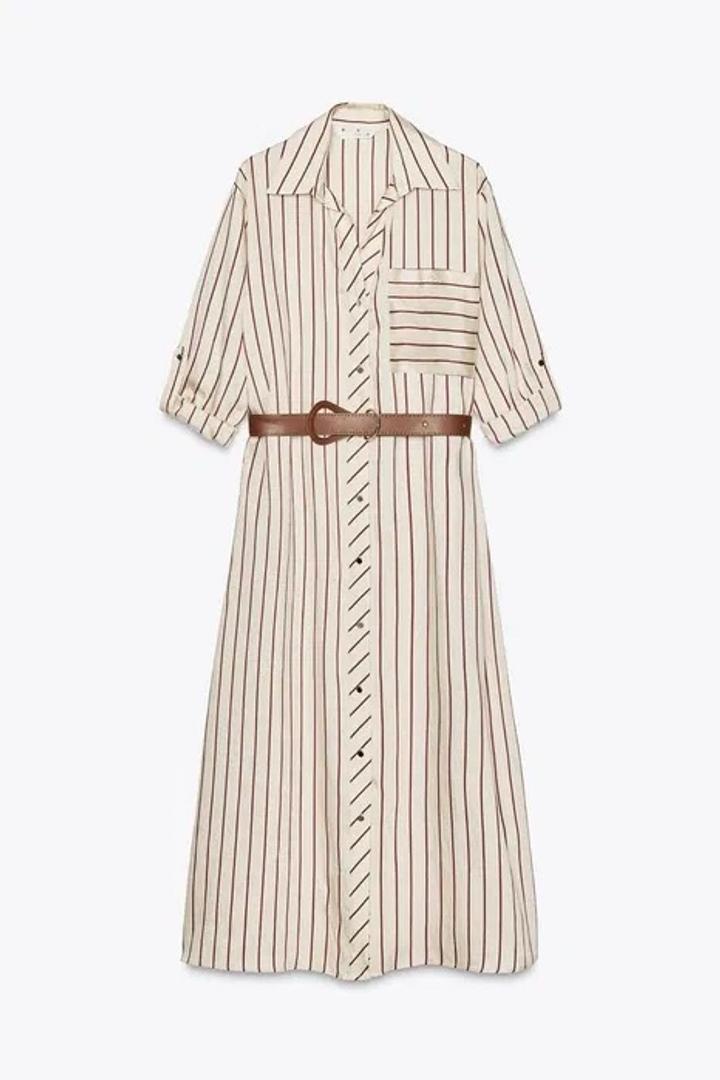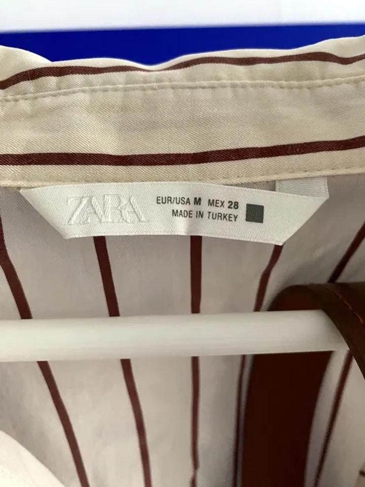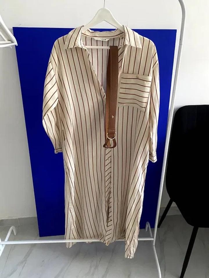 Продаю стильное миди-платье Zara (оригинал, куплено в прошлом году за 33 000 ₸) — полосатое бежево-коричневое, с поясом, рубашечный крой, состояние идеальное! Характеристики: - Крой: рубашка-платье миди (до икр/щиколоток), прямой/лёгкий А-силуэт - Детали: воротник, пуговицы по всей длине, пояс (кожаный коричневый, съёмный) - Рукава: 3/4 или закатываются - Материал: лёгкий, дышащий, не мнётся сильно - Цвет: бежевый/кремовый с коричневыми полосками Состояние: идеальное/почти новое Артикул: 477806