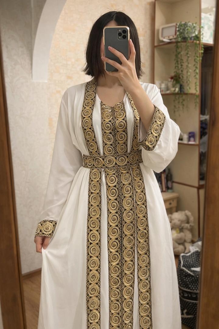 Белое нарядное платье в восточном стиле с роскошной золотой вышивкой. Модель свободного кроя, в пол, с длинными рукавами. Центральная часть, ворот и пояс оформлены плотной декоративной вышивкой в золотисто-чёрных тонах с орнаментом в виде спиралей. Платье подчёркивает талию за счёт пояса, при этом остаётся комфортным и не сковывает движения. Ткань лёгкая, смотрится эффектно как при дневном освещении, так и вечером. Подойдёт для торжеств, свадеб, узату, фотосессий, мероприятий Состояние: новое Артикул: 477897