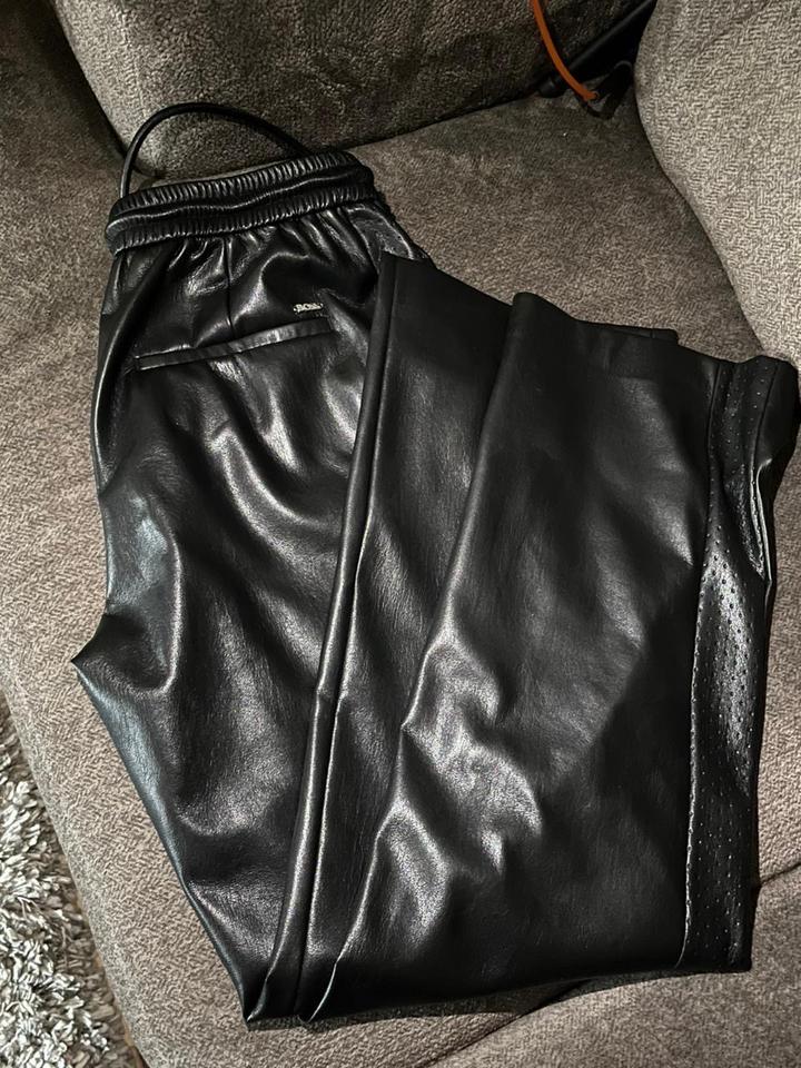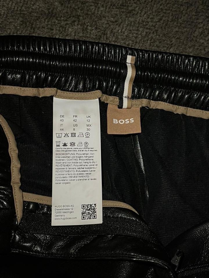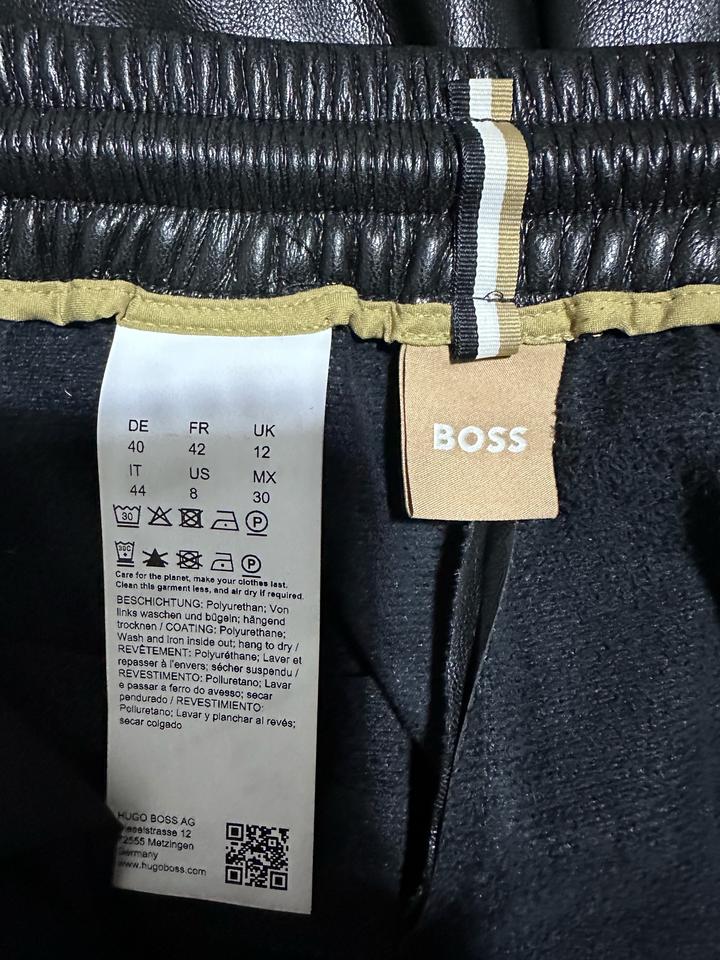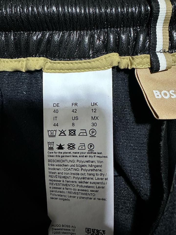 Текст на этикетке содержит инструкции по уходу за одеждой бренда Hugo Boss AG, выполненной с использованием полиуретанового покрытия. Рекомендуется стирать и гладить изделие с изнаночной стороны. Сушить одежду следует в подвешенном состоянии. Для сохранения долговечности изделия рекомендуется стирать его реже и сушить на воздухе. Артикул: 477928