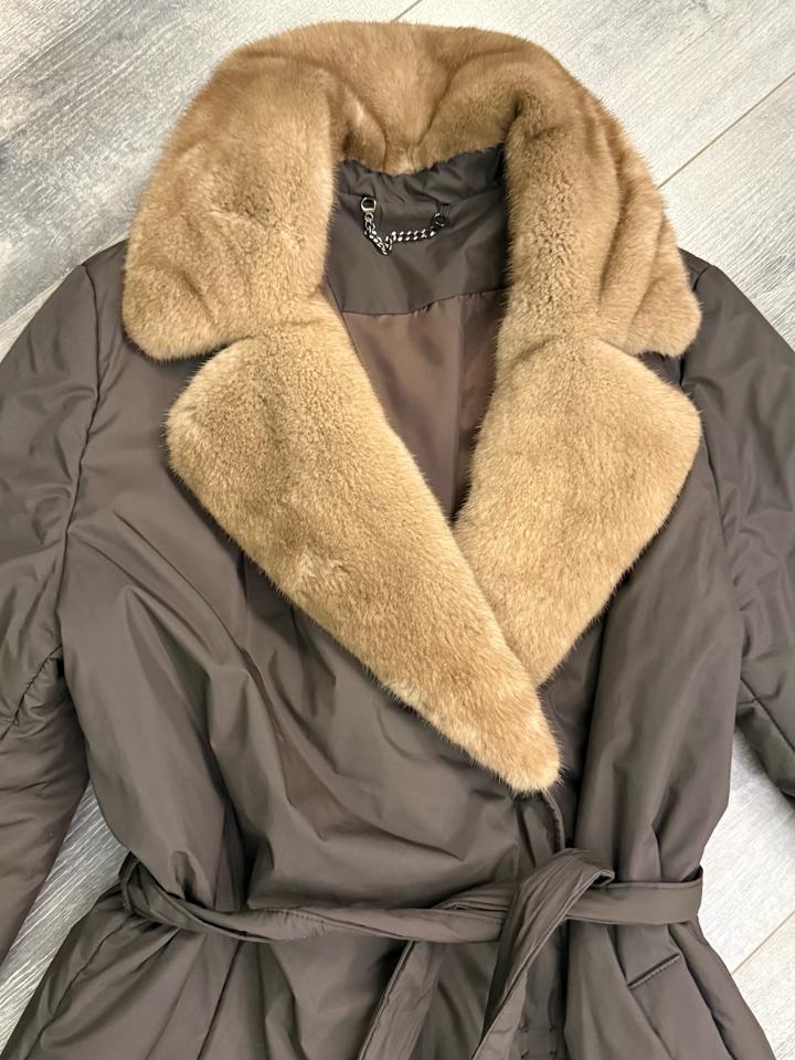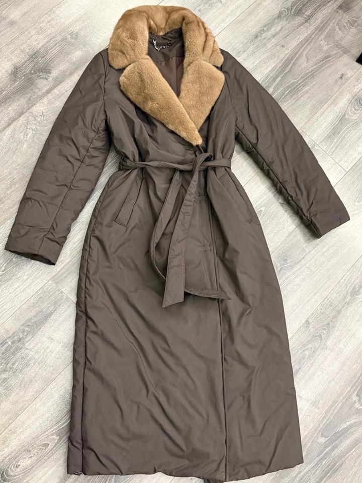Плащ утепленный на весну( полиэстер) Мех натуральная норка Очень красивый Модный шоколадный цвет Артикул: 478196