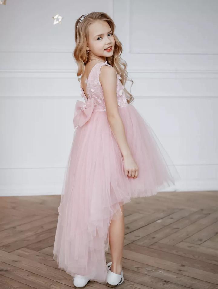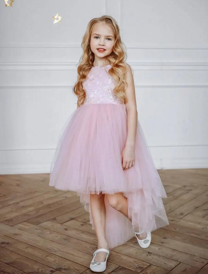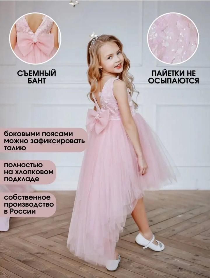 Нежное розовое платье для девочки с бабочками. Размер 122. Спереди короче, сзади как шлейф. Нет только бабочки сзади, но это никак не влияет, так как завязки длинные и сами завязываются в бабочку. Артикул: 478285