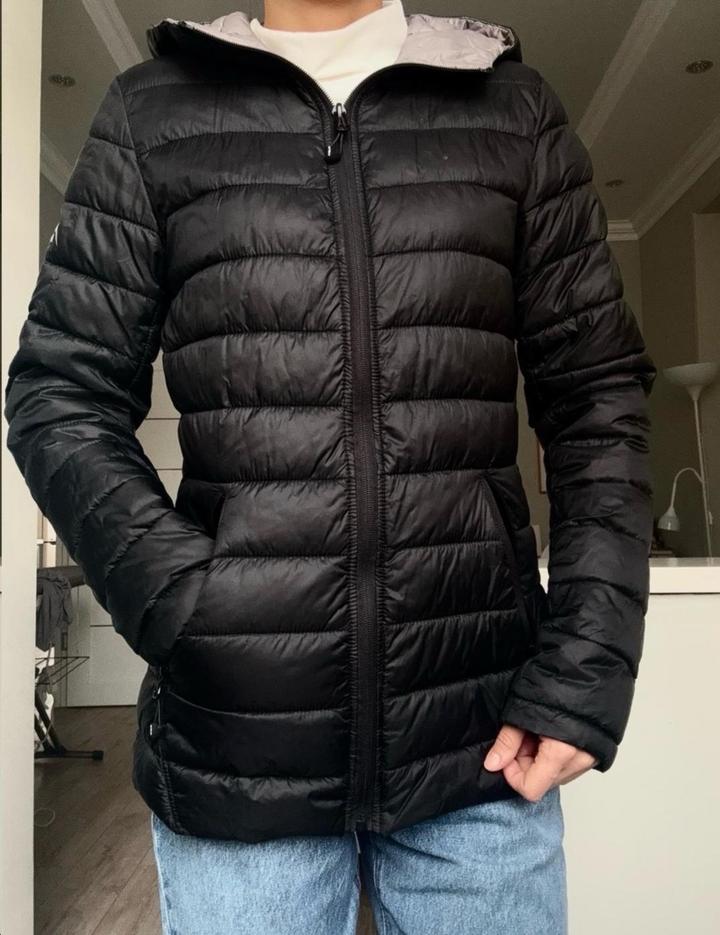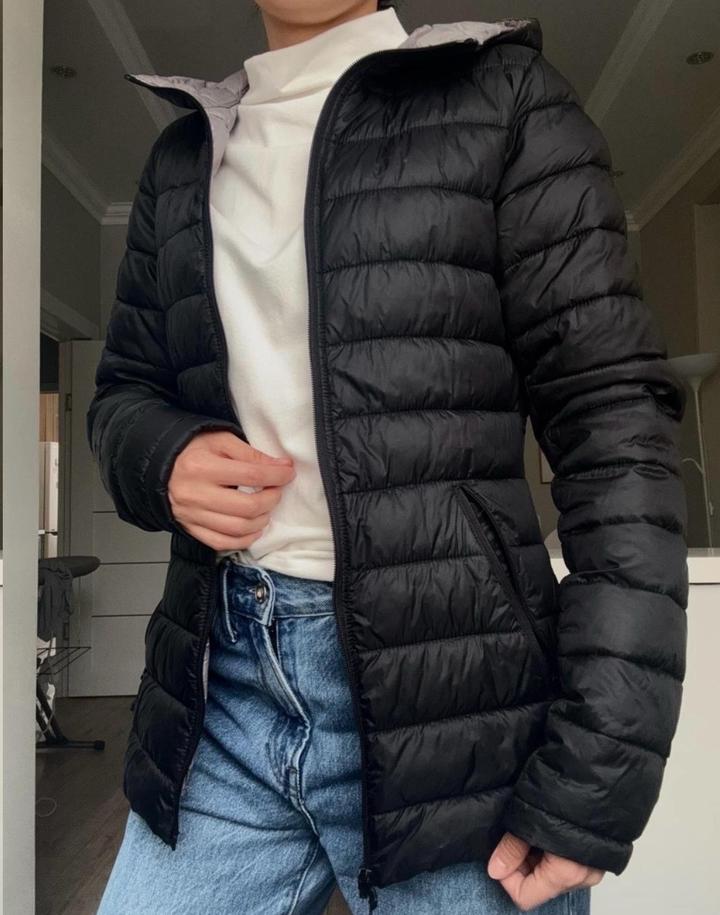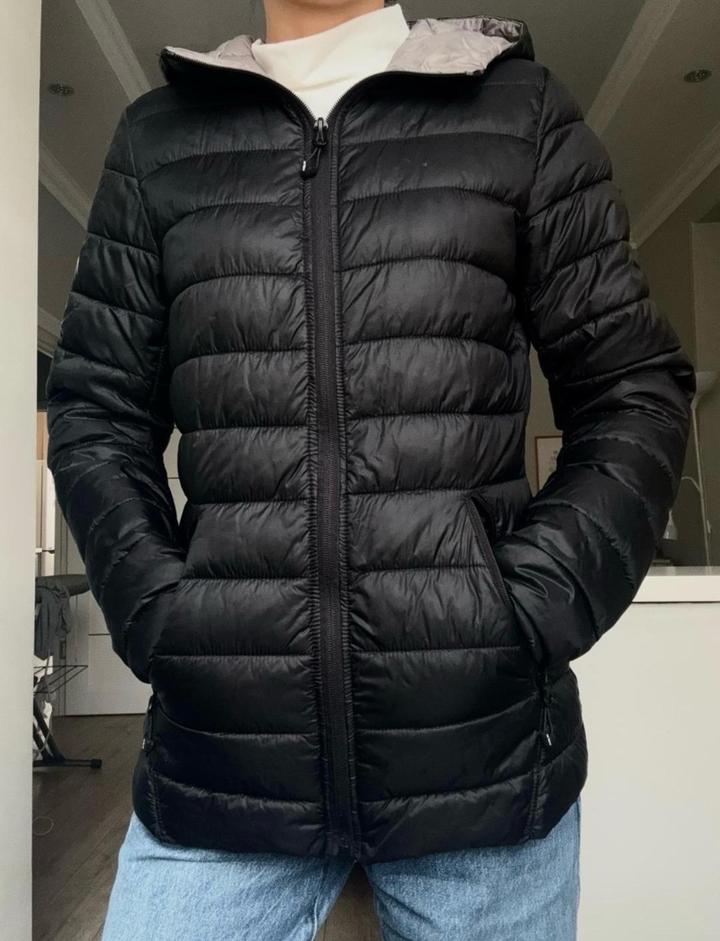 Короткая чёрная стёганая куртка с капюшоном на весну/осень.Лёгкая, но тёплая, застёгивается на молнию, есть боковые карманы. Универсальная базовая модель на каждый день. Состояние отличное, аккуратно носилась. Артикул: 478494