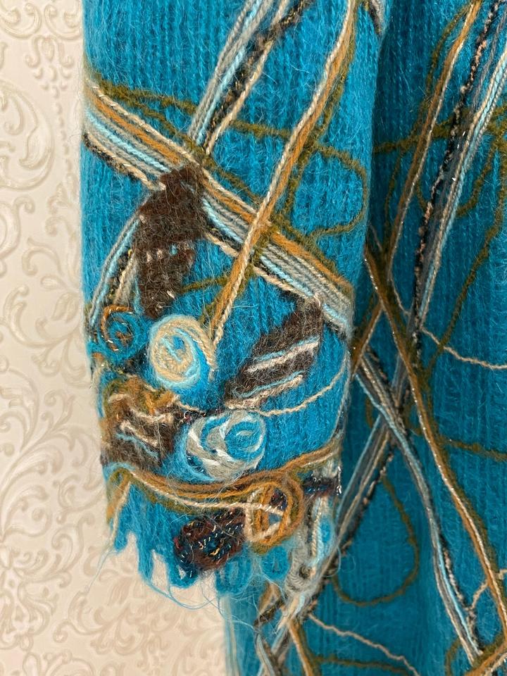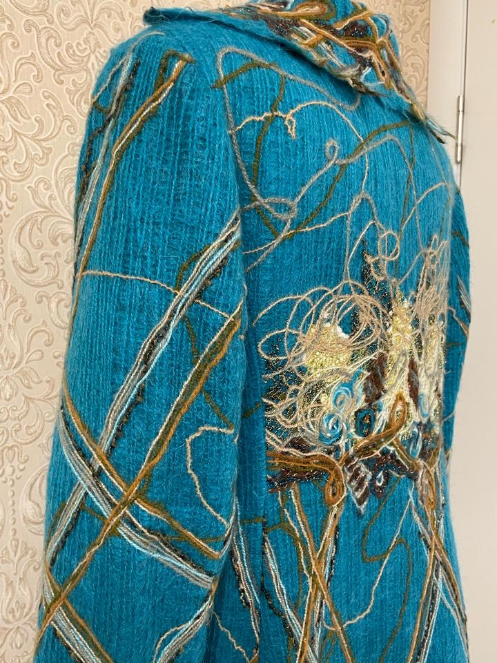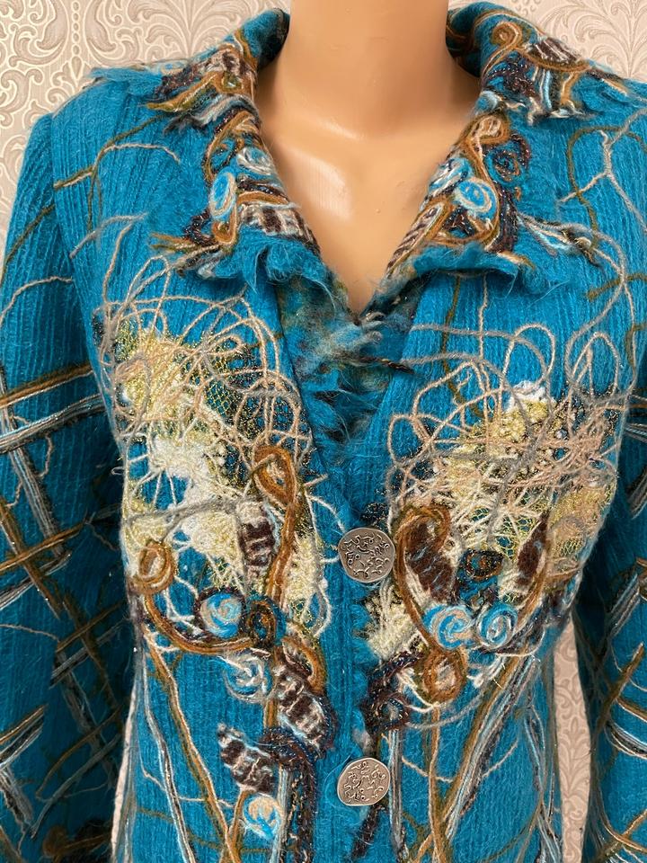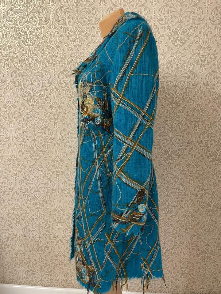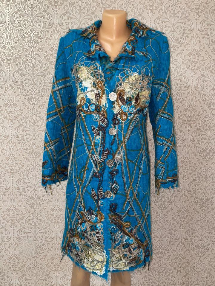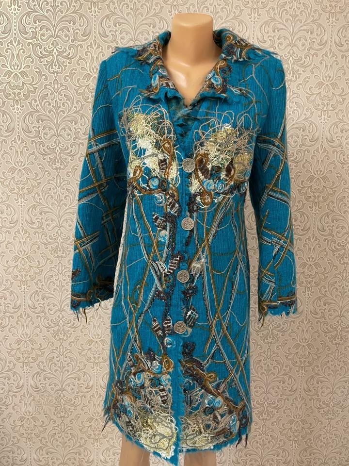 Стильное и эффектное пальто насыщенного бирюзового цвета от бренда Yuko. Состав — 100% шерсть: тёплое, мягкое и комфортное в носке. ✨ Модель с элементами ручной работы — объёмная аппликация, декоративные нити и фактурная отделка. ✨ Оригинальный дизайнерский декор делает вещь яркой и запоминающейся. ✨ Приталенный силуэт, застёжка на пуговицы Почти не носилось Состояние отличное, без дефектов Подойдёт для стильных осенне-весенних образов. Артикул: 478537