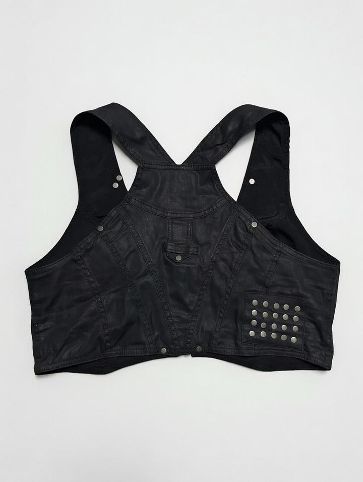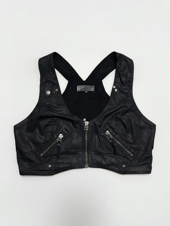 Кроп-жилетка байкер / punk 2000-х Чёрная экокожа + молния спереди + заклёпки + карманы на молнии Короткий кроп, широкие бретели, оверсайз vibe Размер L–XL (подойдёт S–M на кроп, L–XL нормально) Артикул: 478609