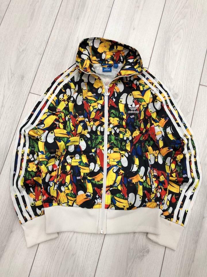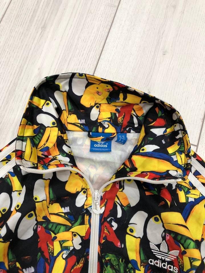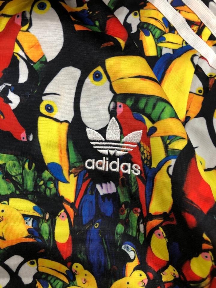 Adidas x FARM Rio Passaredo — яркая лимитированная коллаборация с бразильским брендом FARM Rio, вдохновлённая тропиками. Всё тело покрыто сочным all-over принтом с экзотическими попугаями, туканами, бананами и разноцветными птицами — настоящий взрыв лета и позитива! Размер: S (подойдёт на XS–M, женский крой, укороченный) Артикул: 478618