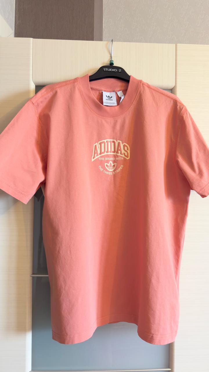 Крутая футболка цвет персик(сёмга) ,можно и парням и девушкам , на 48/50 размер или как оверсайз носить, на горловине резиновая вставка , вся спина сзади в логотипе большом , состояние идеальное без нареканий , покупала на официальном сайте 100% хлопок Артикул: 479048