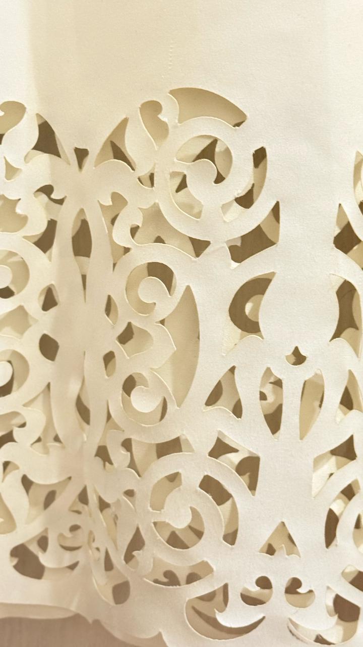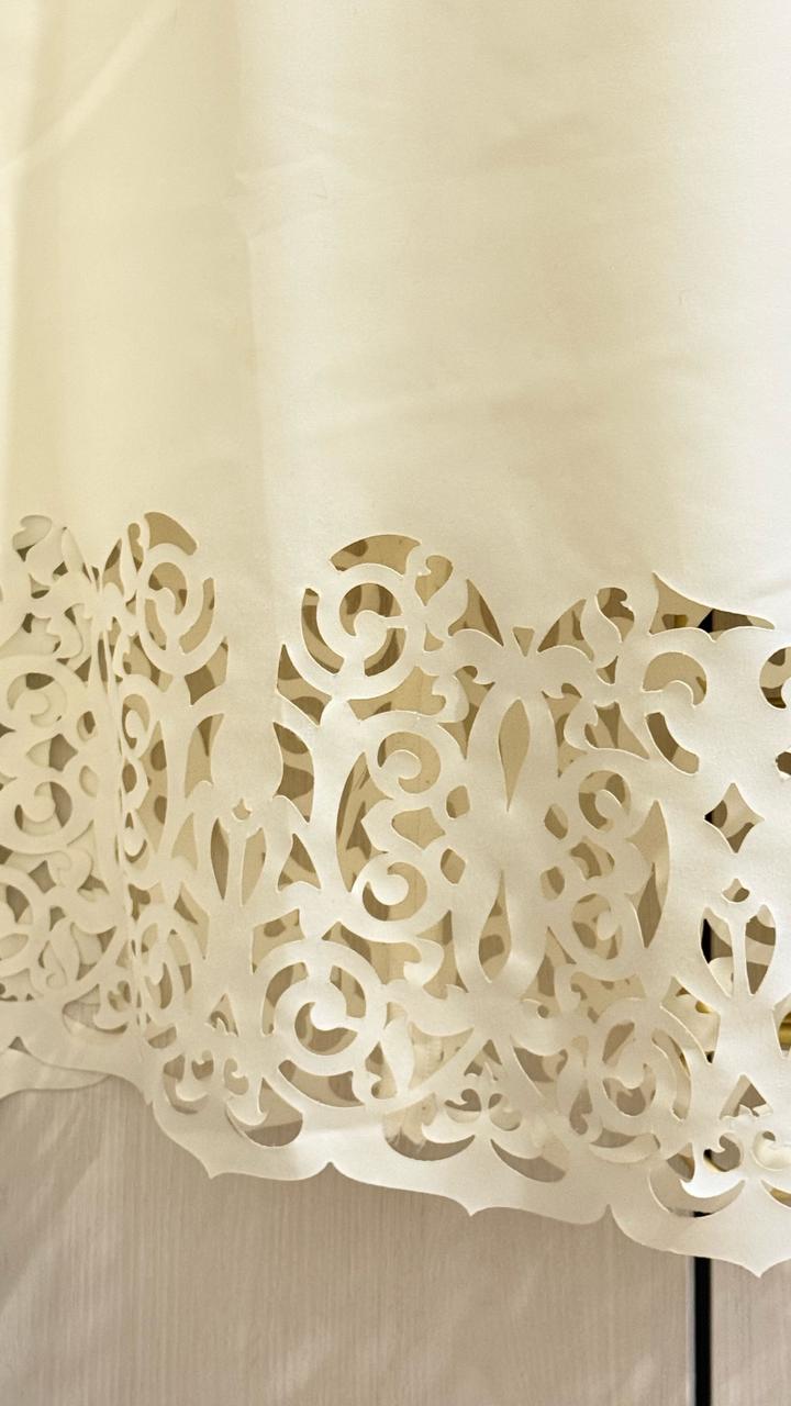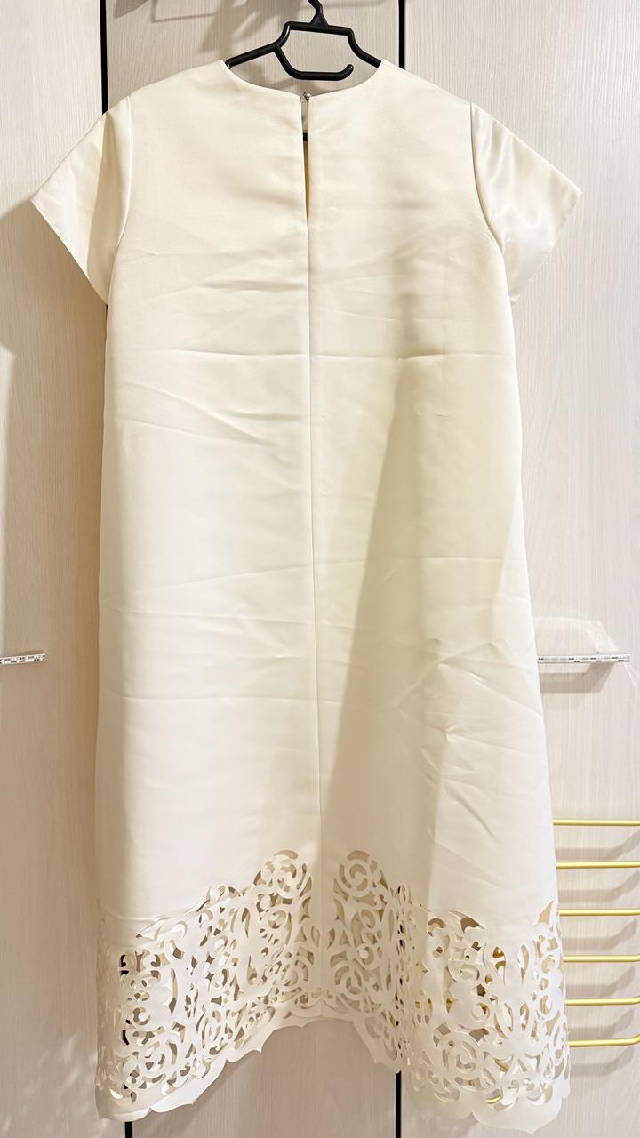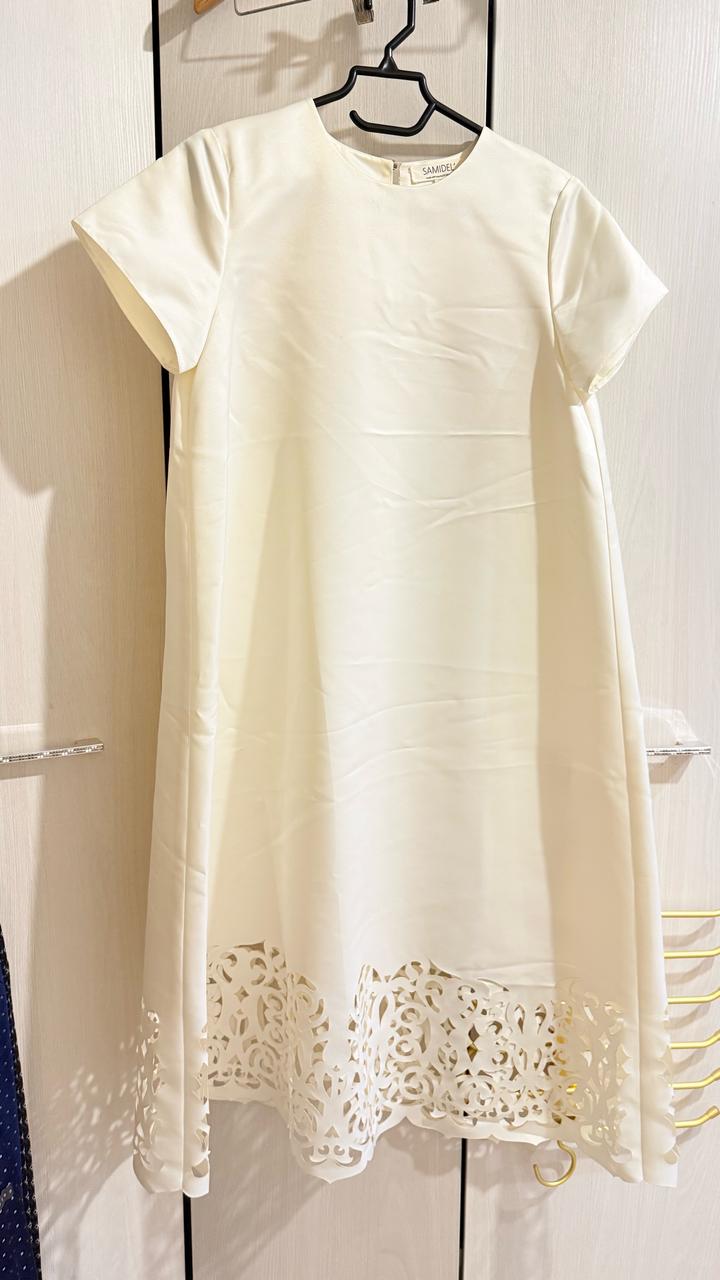 Платье А силуэта ( примерно как трапеция) от казахского бренда Samidel. На подоле орнамент. Ткань плотная. На правом рукаве немного торчат нитки по шву, фото прилагается. Артикул: 479527