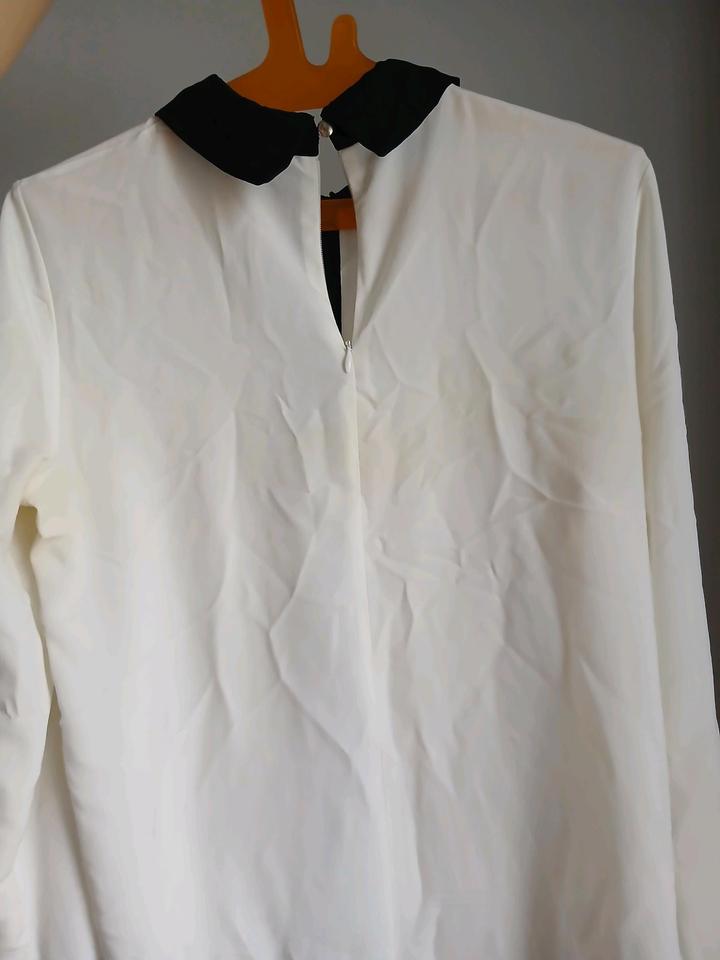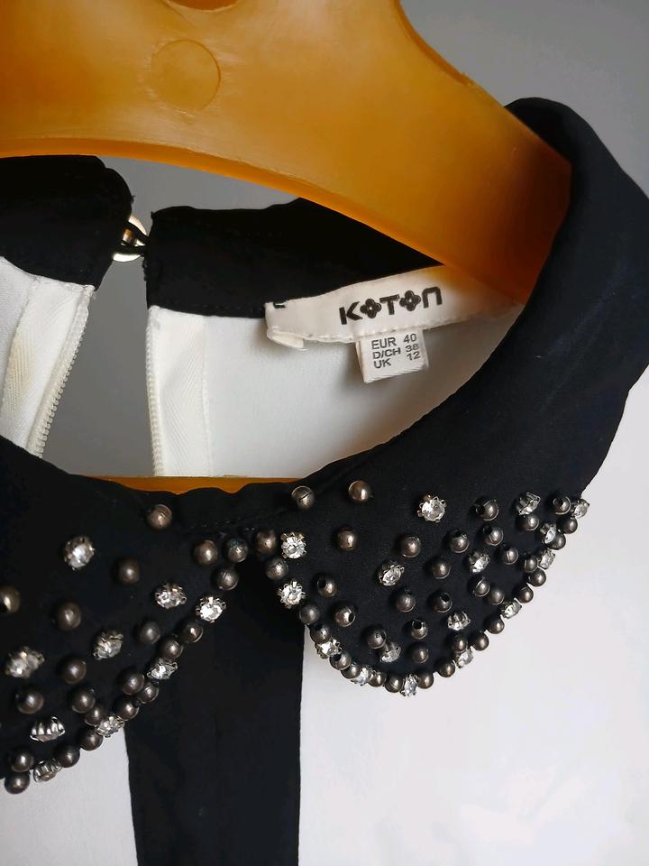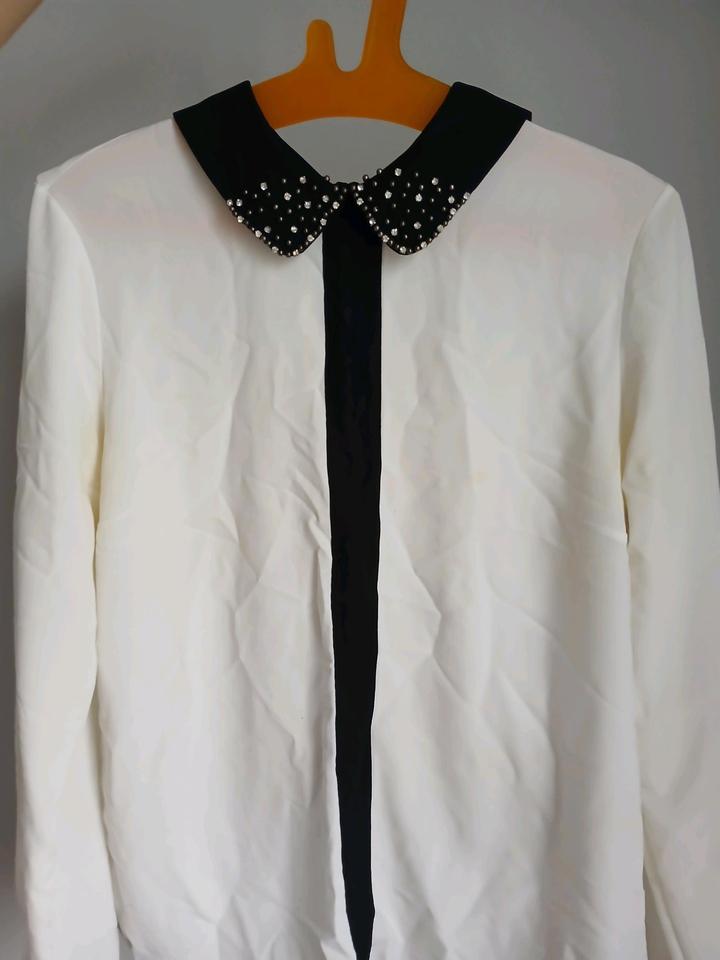 Блузка в цвете айвори с черным воротником прошиты мелкыми бусинками, стразами и черными манжетами. Сзади закрывается на пуговицу и на замок. В идеальном состоянии без дефектов. Артикул: 479646