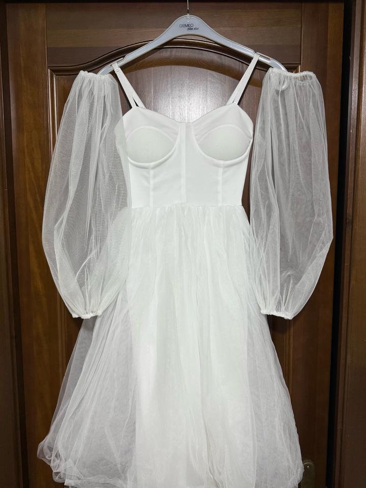 Нежное белое платье на тонких бретелях с акцентом на линии груди. Верх с формованными чашками. Пышная юбка из фатина создаёт лёгкий, воздушный образ, длина миди. Бретели регулируются, на спине резинка. К платью есть рукава фатиновые на резинках, можно надеть на руки и по желанию менять форму, длину(на 4 фото).Рукава шили как дополнение, они не было с платьем. Подойдёт для мероприятия, выпускного и т.д. Надевала только 1 раз, на школьную аттестацию, без дефектов, в отличном состоянии, как новое. Артикул: 479932