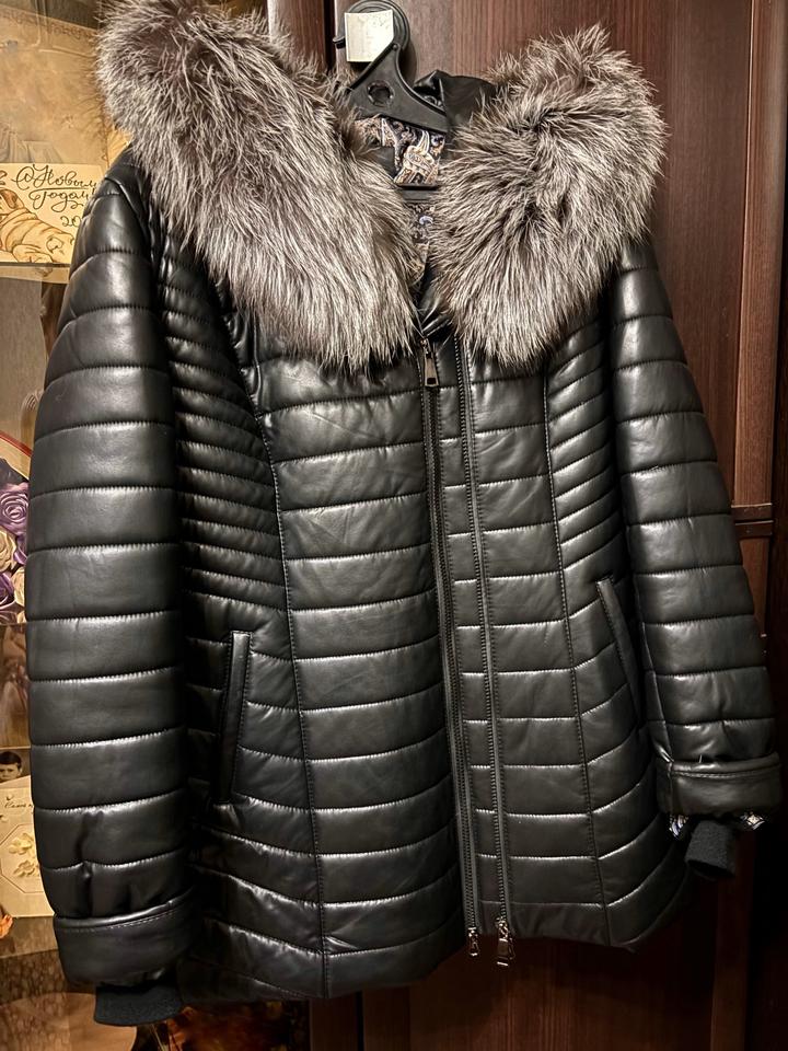 Пуховик из экокожи Мех чернобурка Ни разу не носили, только примерка была Имеет две молнии Размер указан 60 Но на самой дальней молнии узковат на размер 52-54. Красиво сидит по фигуре Артикул: 479988