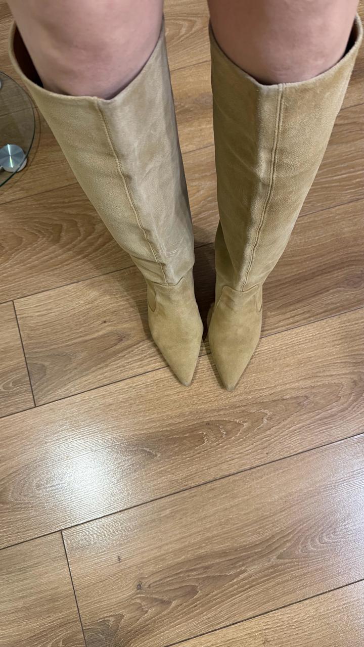 Продам сапоги трубы, 38 размер, замша натуральная, купленны за 110 тыс, одевала несколько раз и попала под дождь. Требуется хим чистка, в цене учтено. Очень красивые и сидят на ноге Артикул: 480046