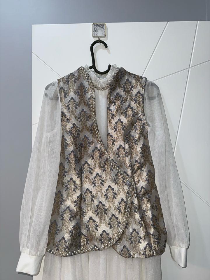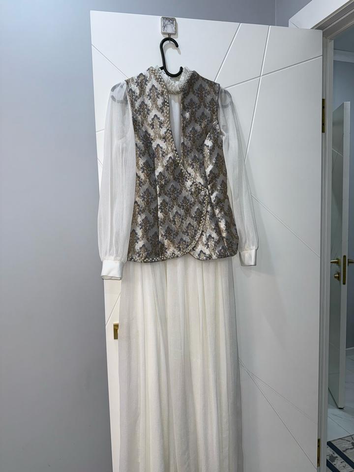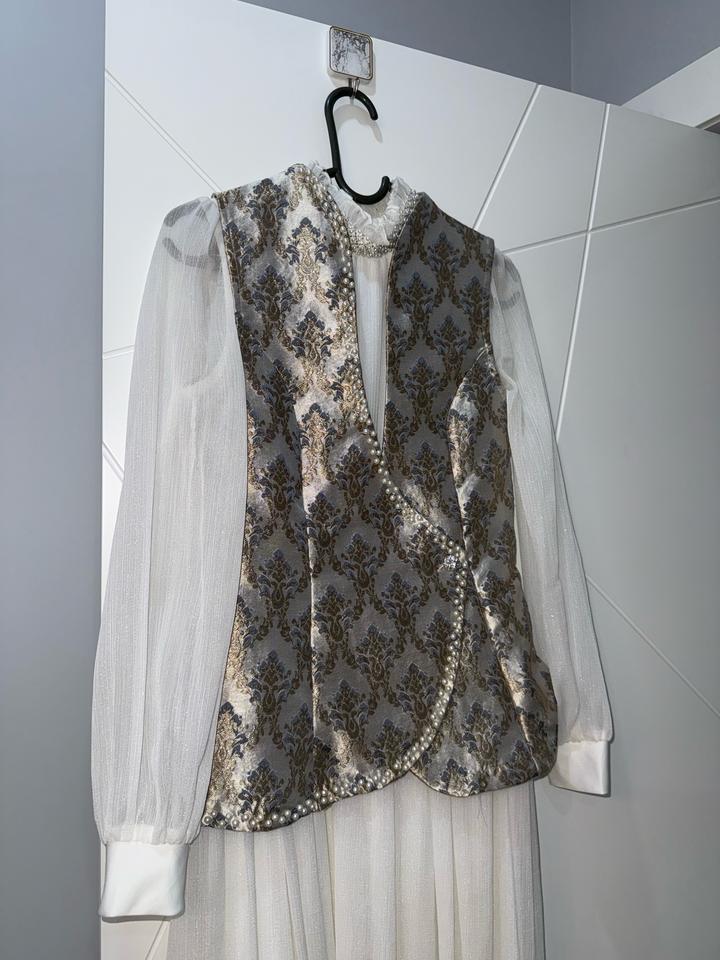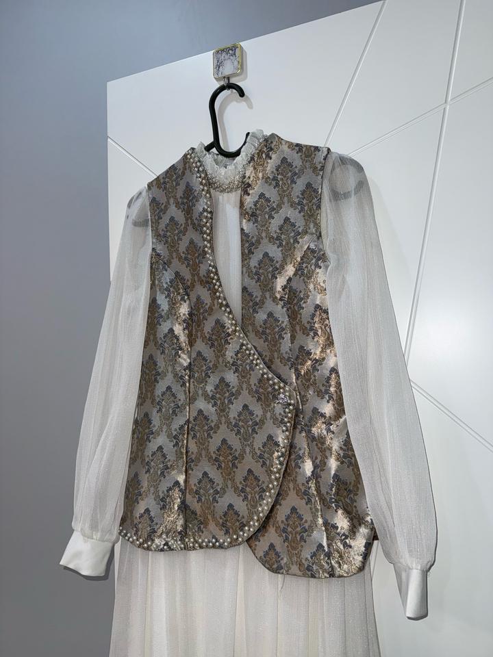 Продаётся очень нежный и элегантный комплект: длинное платье и декоративная жилетка с красивым узором. Жилетка придаёт образу особую изысканность и нарядность. Надевала только один раз — на сырга салу. Состояние отличное, почти как новое. Артикул: 480204