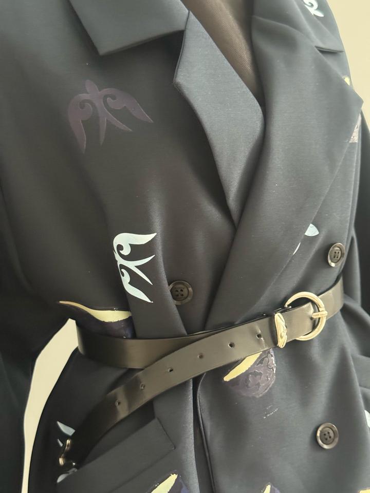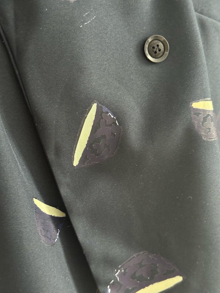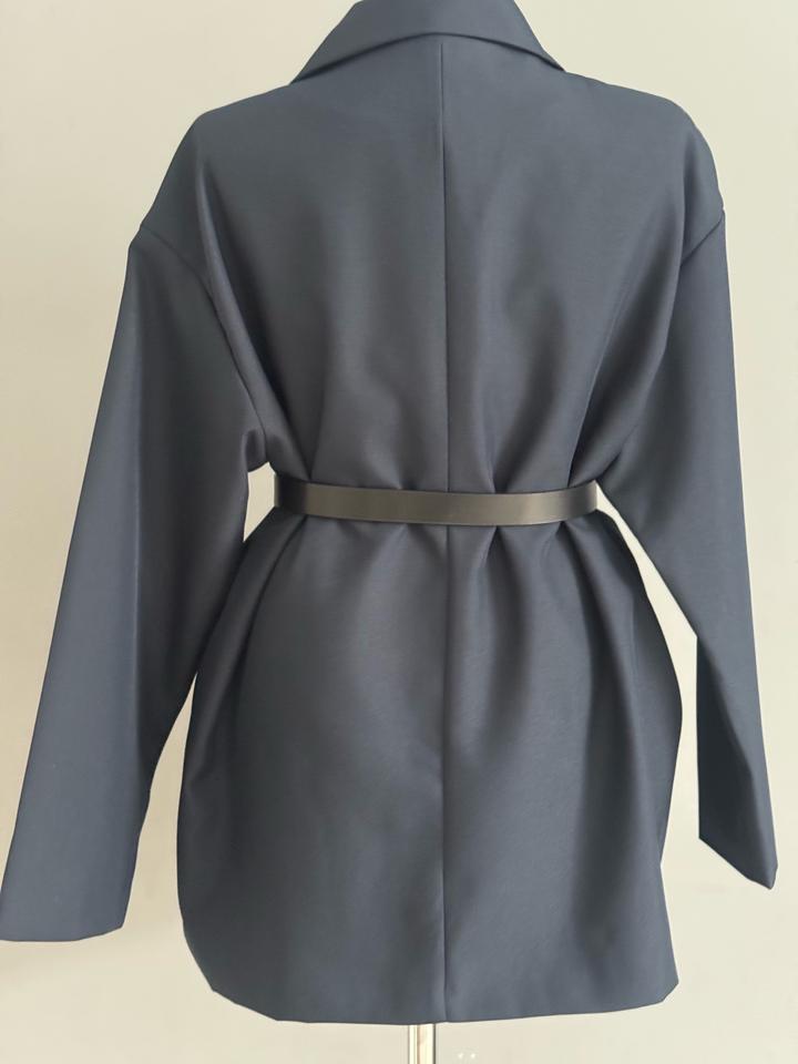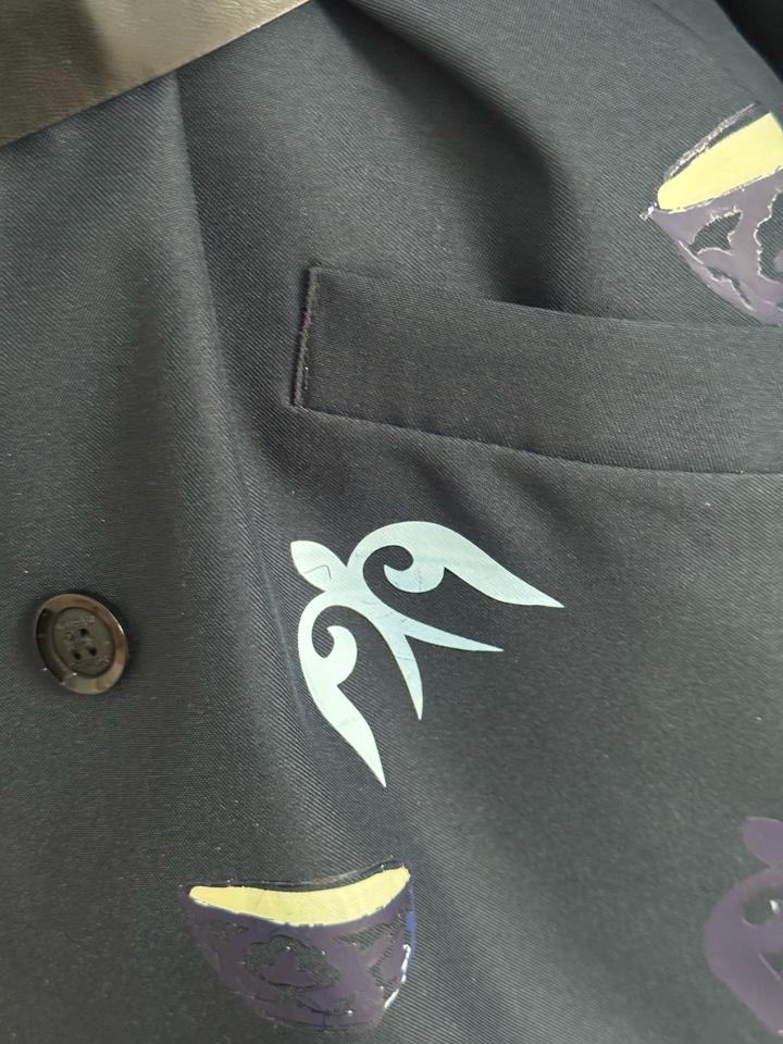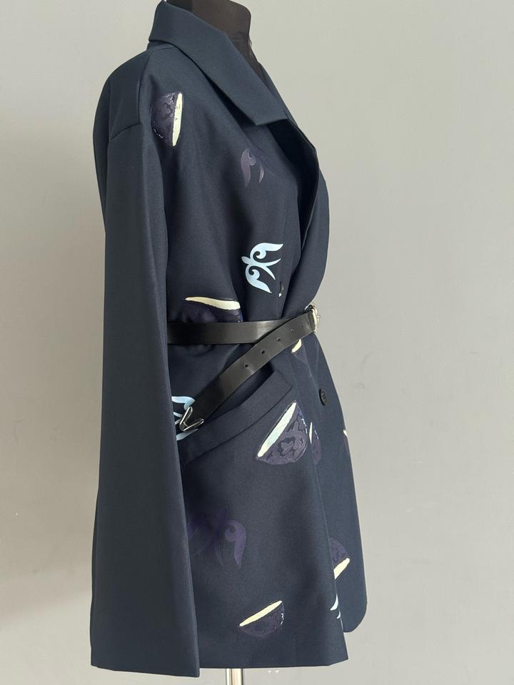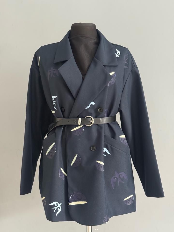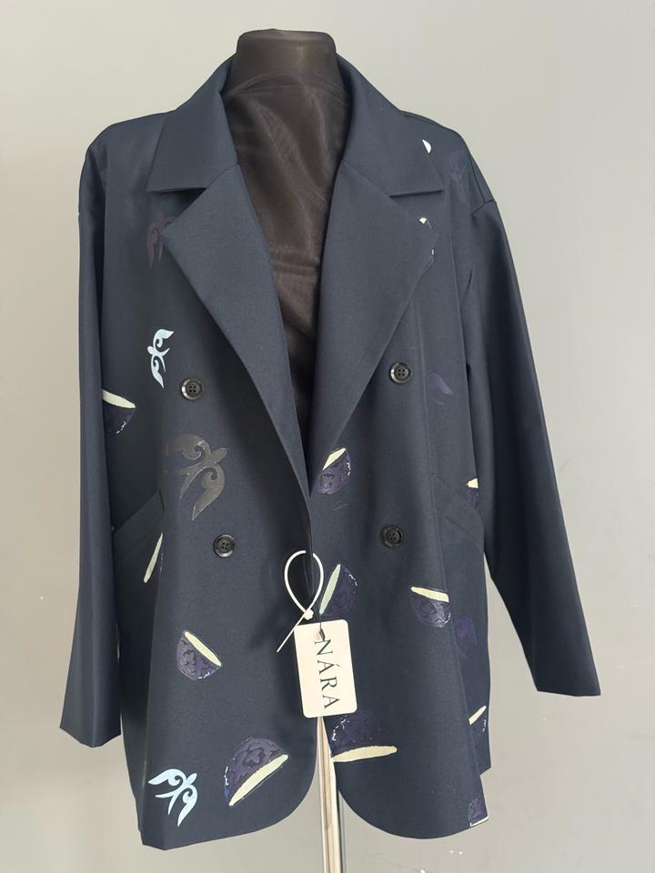 Темно-синий пиджак в современном национальном стиле с принтами, размер пиджака Л, манекен размером М, ручная работа, в единственном экземпляре, без ремня Артикул: 480728