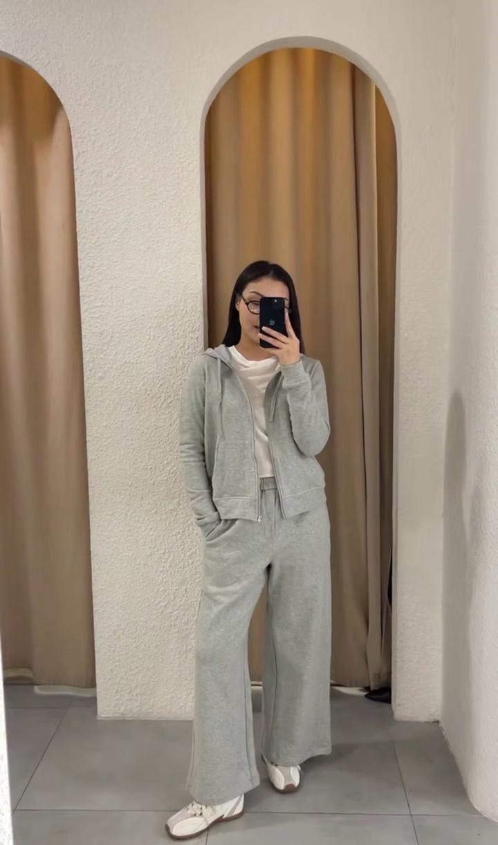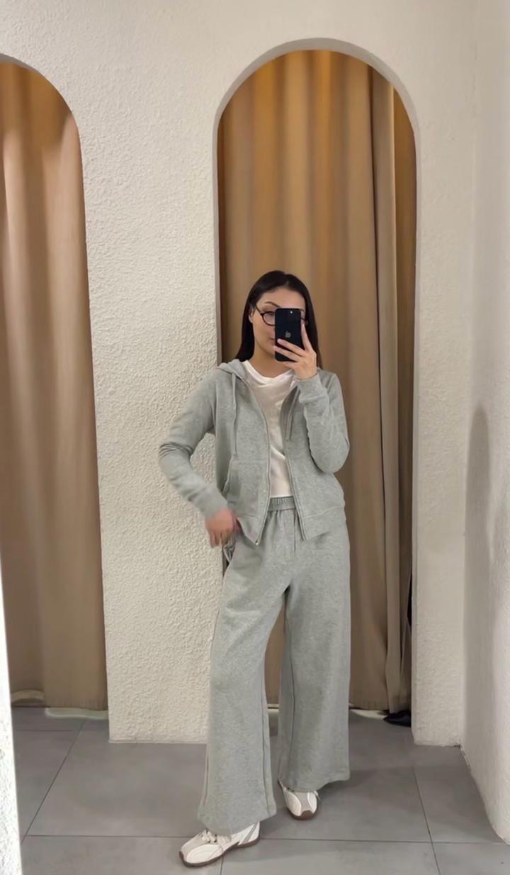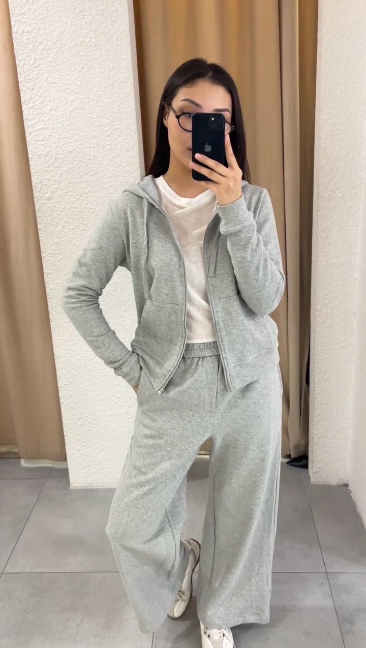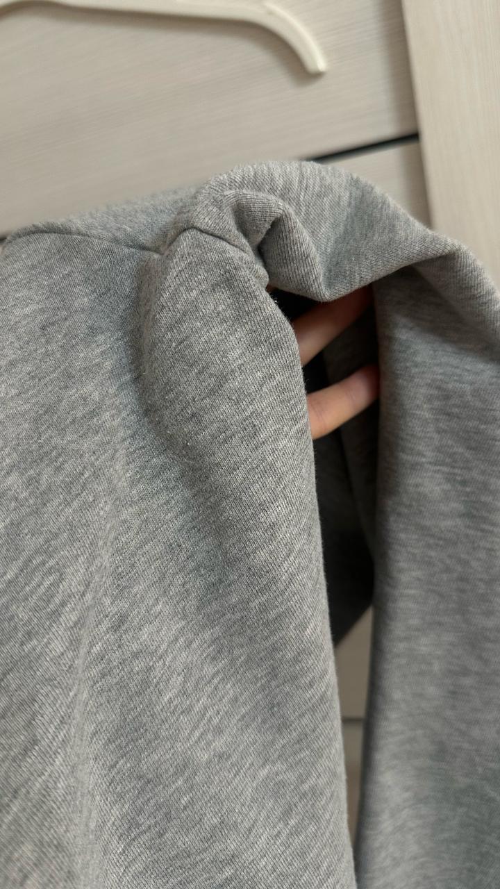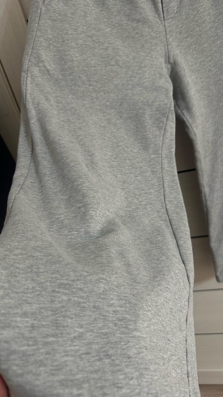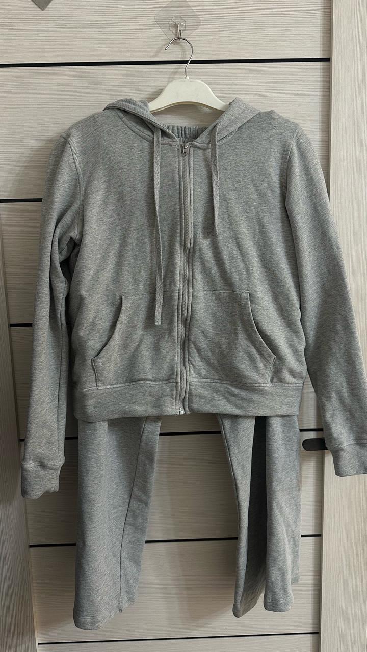Спортивный комплект в сером цвете. Отличная база, из двунитки. Верх на молнии, обьемный капюшон, брючки свободного кроя на резинке. Есть следы носки. Состояние хорошее, присутствуют лёгкие следы носки. Артикул: 480774