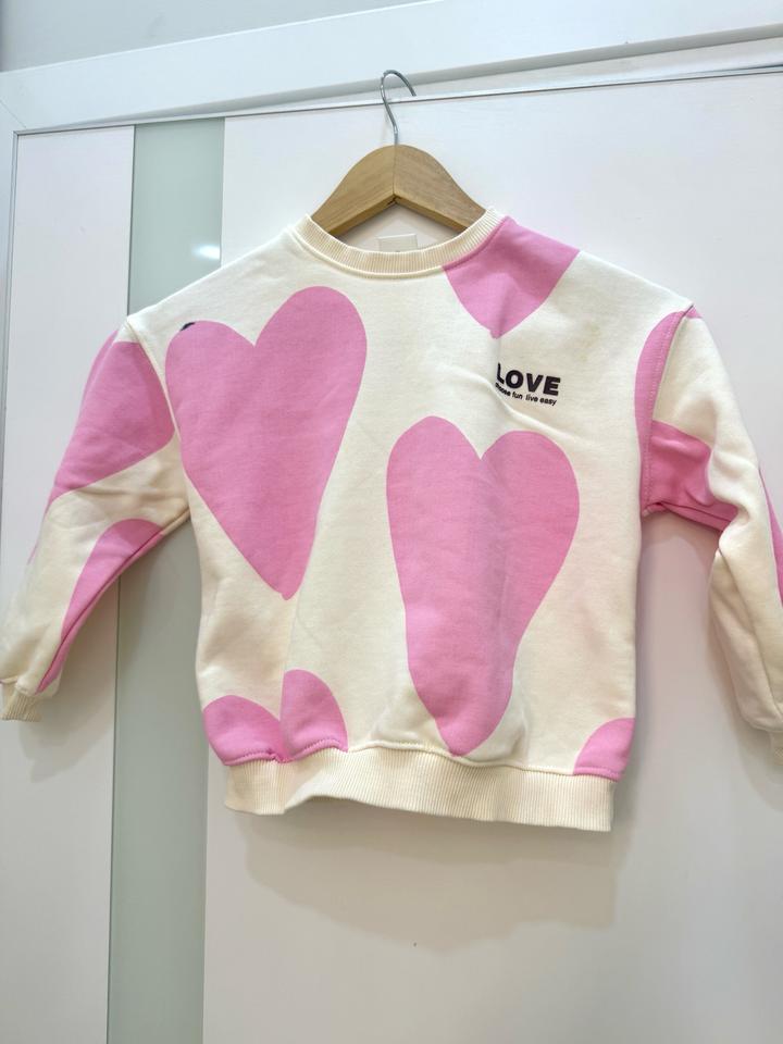 Детская толстовка с сердечками. В хорошем состоянии. Есть небольшой дефект — пятно от маркера. Размер 110см Артикул: 481026