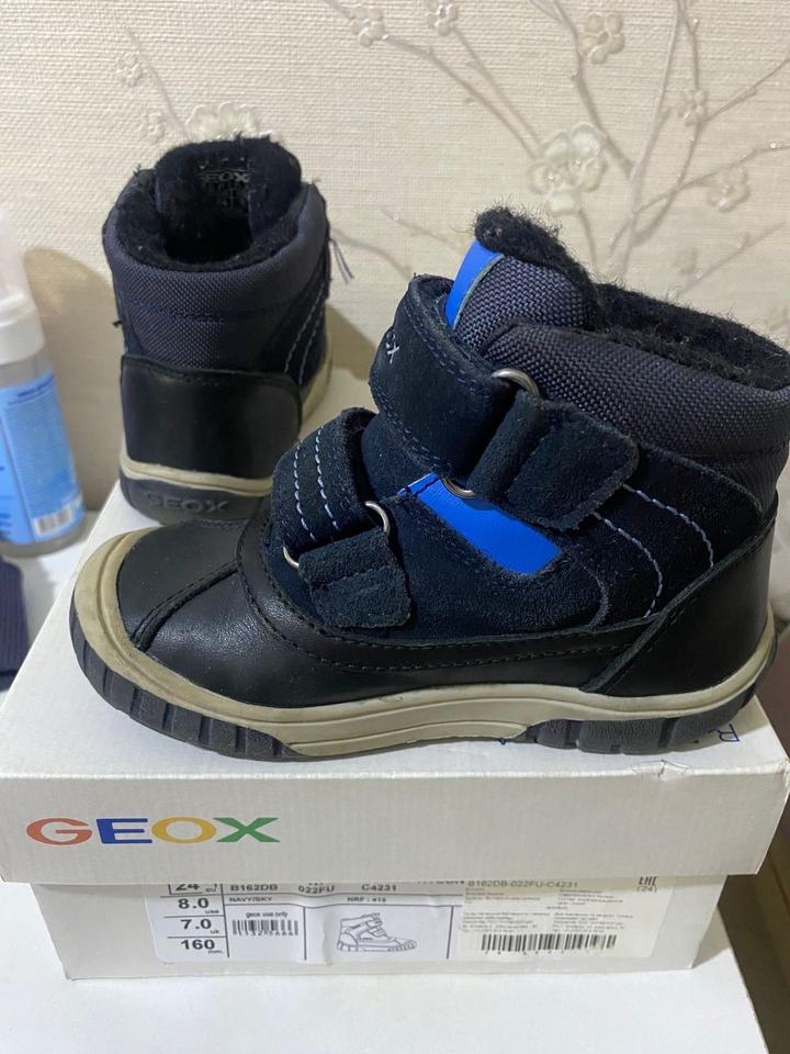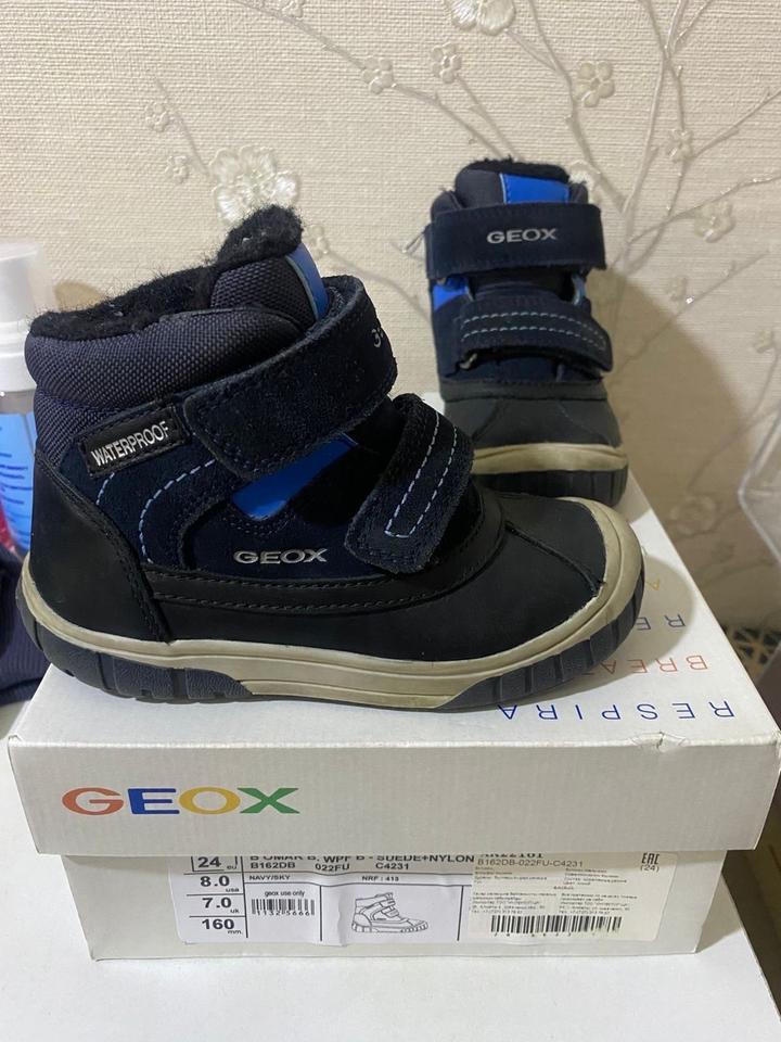 Зимняя обувь бренда Geox, надевали всего несколько раз. Состояние очень хорошее, чистые, без повреждений и дырок. Размер 24, для мальчика. Артикул: 481039