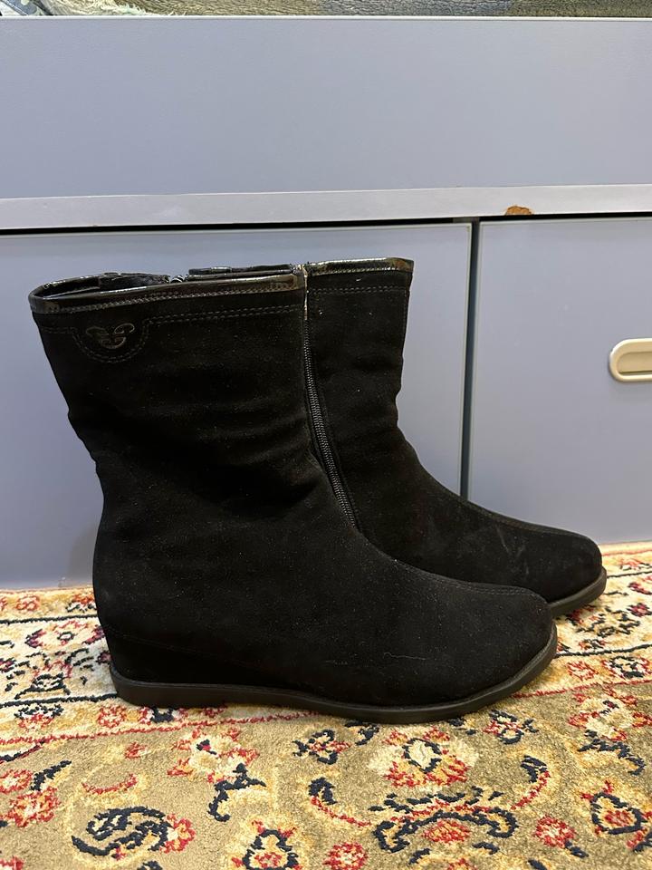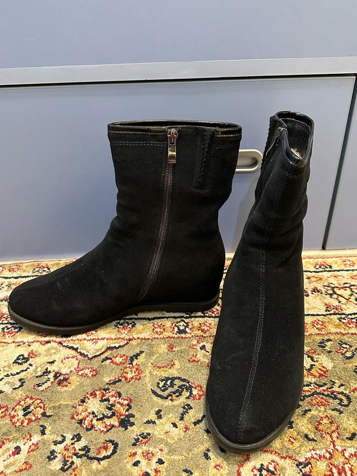 Замшевые черные ботинки (натуральная замша). Теплые, на зимний период, с натуральным мехом внутри. Размер 40, немного маломерки, на 39 будет хорошо. В отличном состоянии. Артикул: 481226