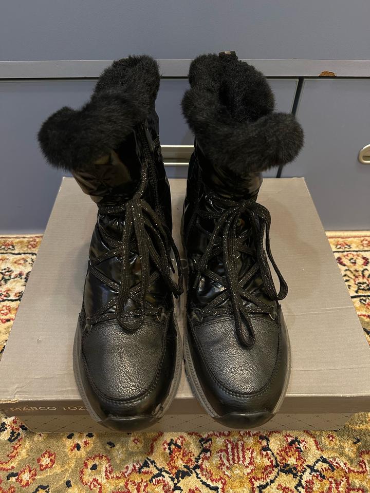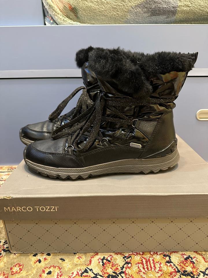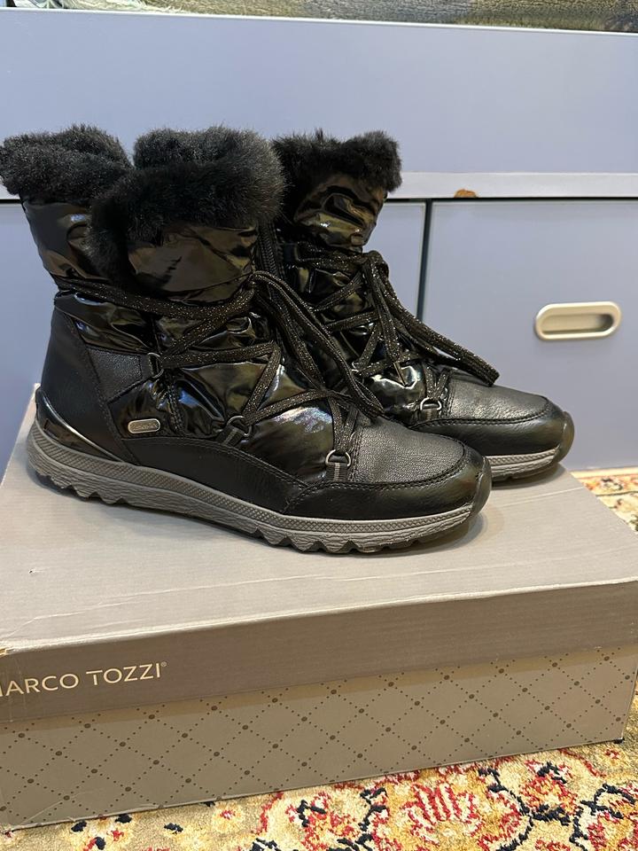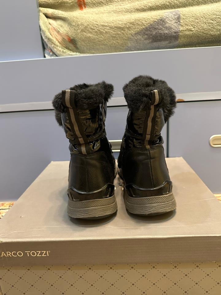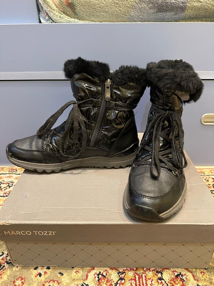 Черные зимние ботинки Macro Tozzi. Кожаные с лакированными вставками. В отличном состоянии. Артикул: 481234