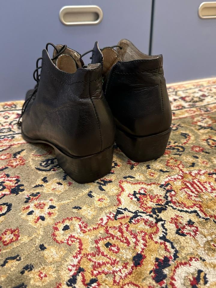 Черные ботинки из натуральной кожи. В хорошем состоянии. Сбоку на замочке, и шнурки имеются. На небольшом каблуке, колодка удобная. Демисезонные, на осень и весну классно будут. Артикул: 481257
