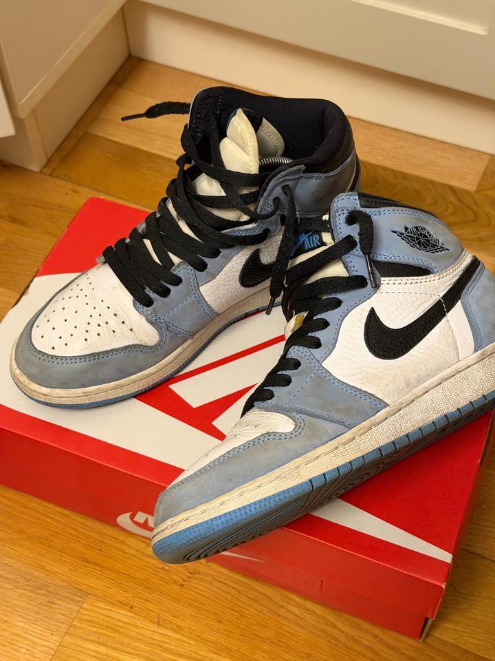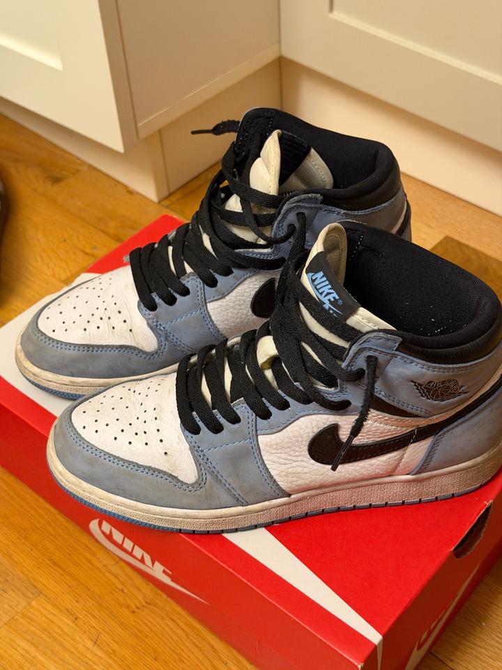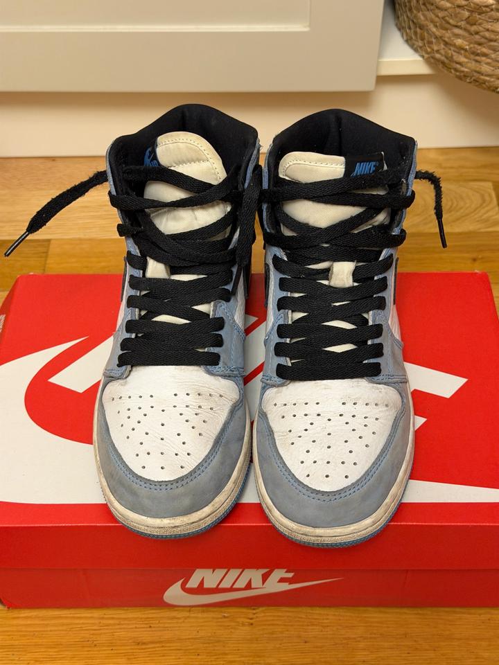 Nike Air Jordan 1 University Blue Продам кроссовки Nike Air Jordan 1 University Blue. Размер 38. Оригинал, заказывала из Америки. Стильная и популярная модель, удобные для повседневной носки. Состояние хорошее, есть коробка. Артикул: 481890
