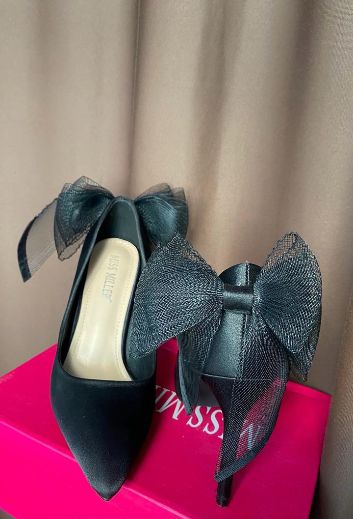 Черные туфли на шпильке в отличном состоянии. С бантами. Очень классно смотрится на ноге Артикул: 481955