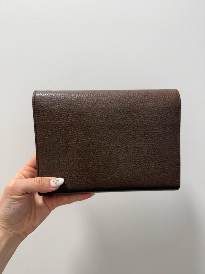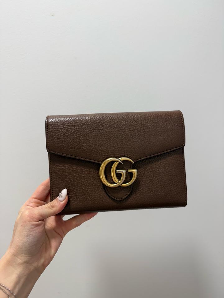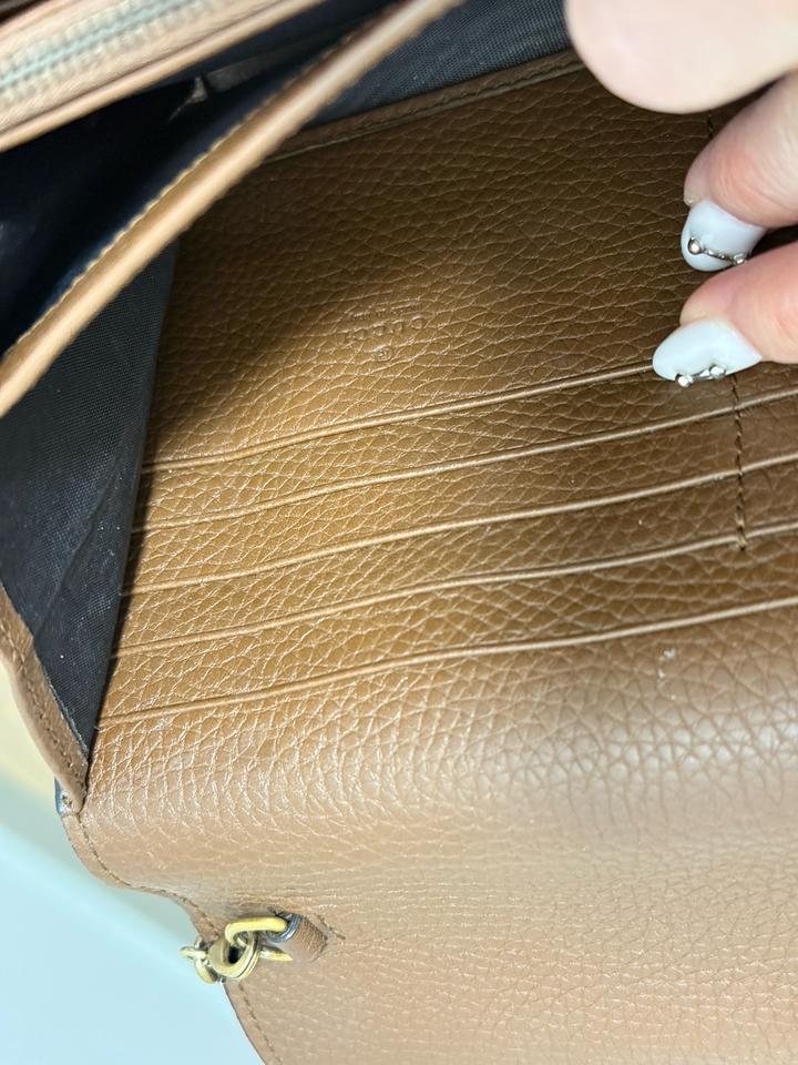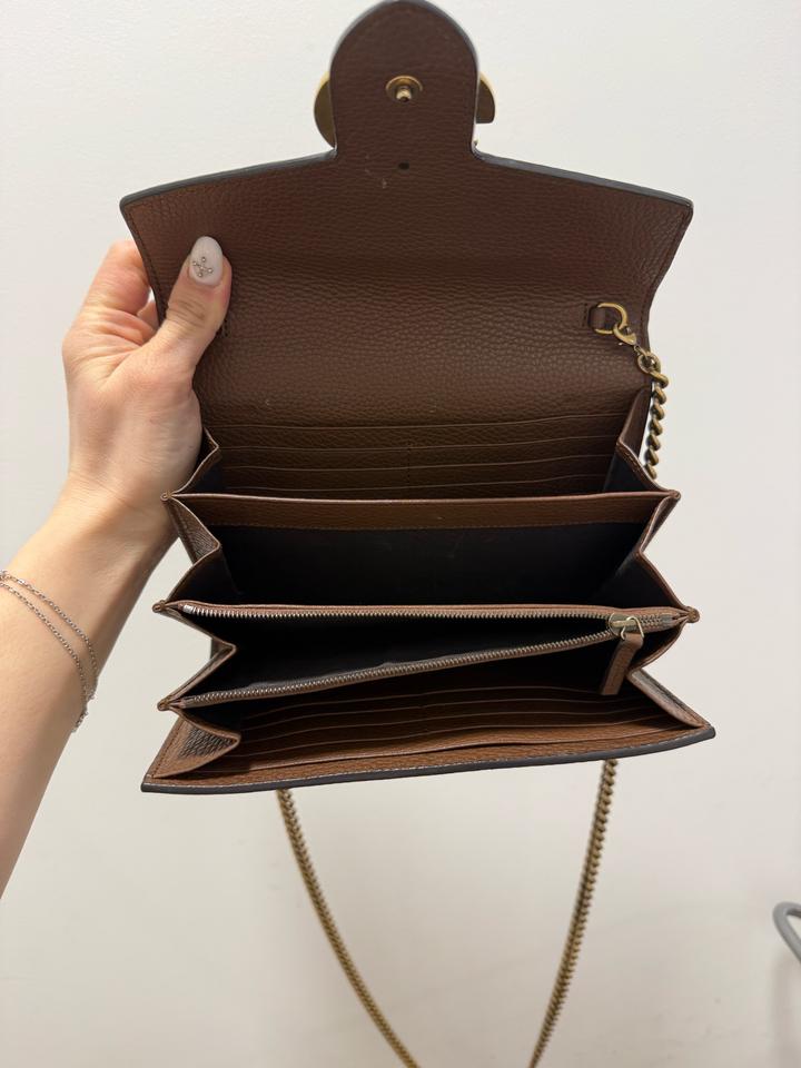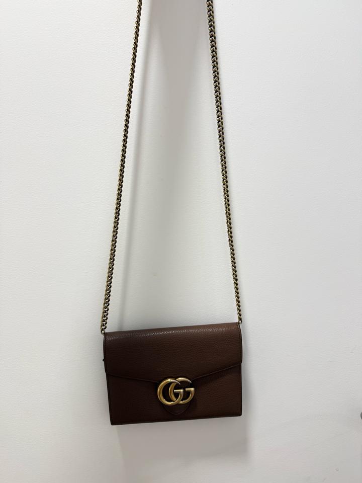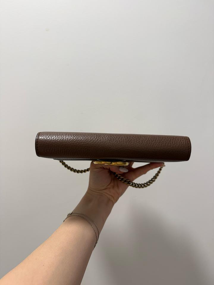Сумка через плечо с длинной цепью в жёлтом цвете, сумка благородного коричневого цвета. внутри много отделений для карточек, монеток, для телефона. Состояние хорошее, внутри чистая, снаружи опрятная. Артикул: 482195