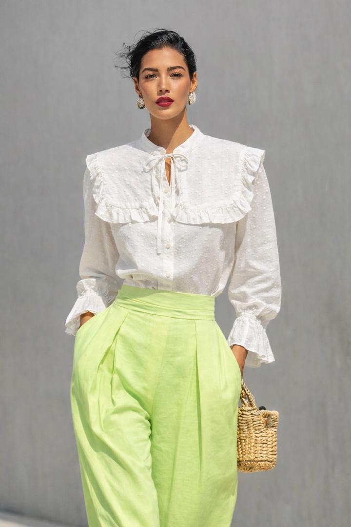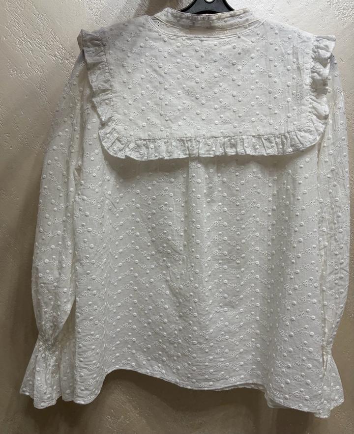 Блуза в молочном оттенке выполнена из ткани с деликатной фактурной вышивкой. Модель украшена раздельным широким воротником-пелериной с аккуратной рюшей. Артикул: 483033