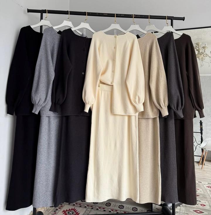Вязаная двойка с юбкой в коричневом цвете (на фото крайняя справа). Кофта на пуговицах, юбка прямая макс длины Артикул: 483459