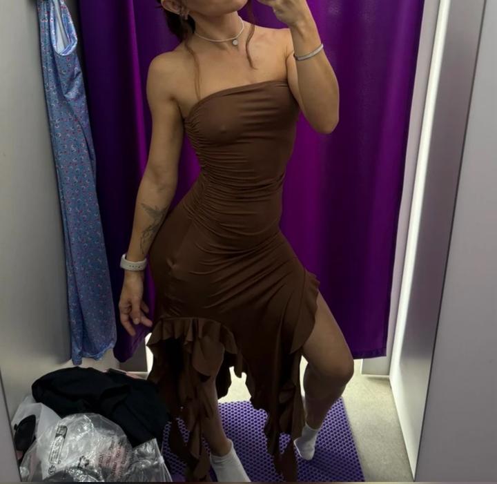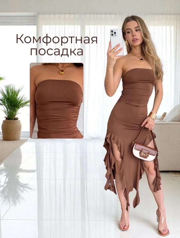 Коричневое нарядное вечернее женское платье создано для девушек на лето. Размер S-M. Это легкое элегантное модное летнее платье с открытыми плечами и с двумя вырезами на ногах идеально подходит на торжество, в отпуск на море, для танцев, на выпускной, фотосессий, в клуб. красивое платье с воланами. Артикул: 483511