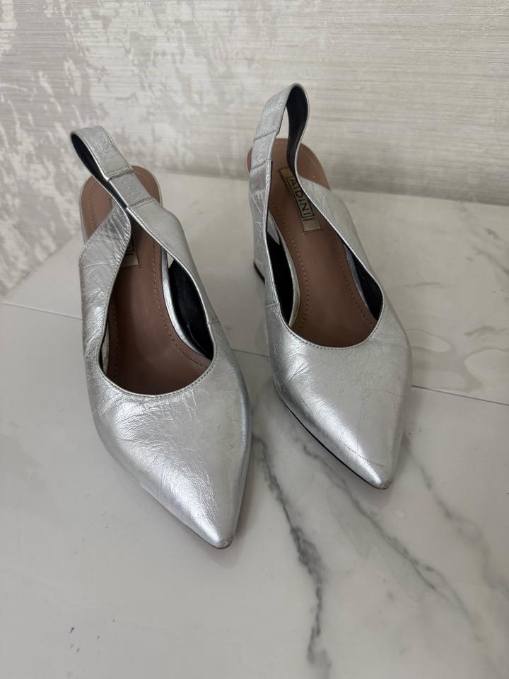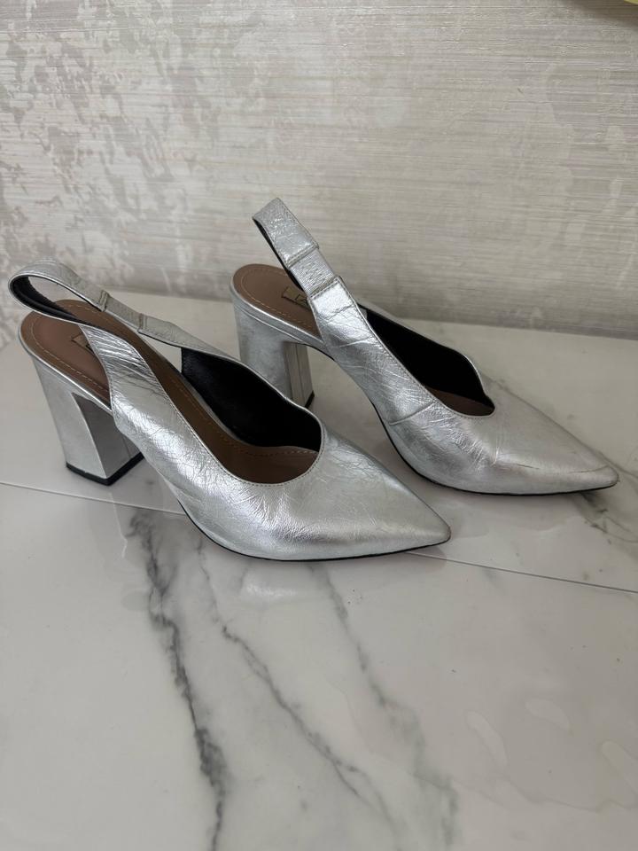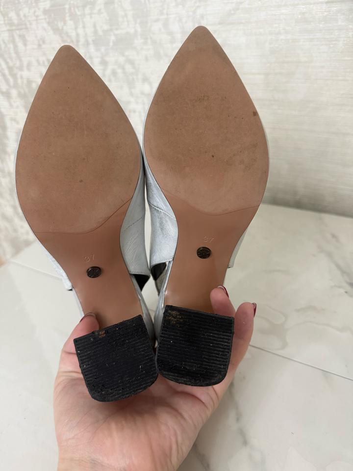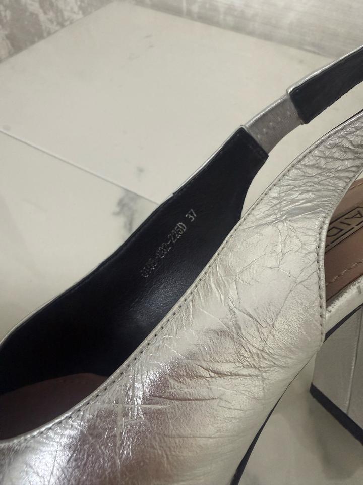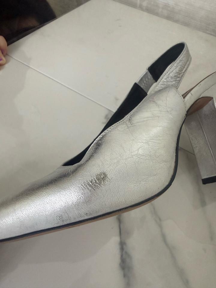 Серебристые туфли. Есть небольшие царапины, которые можно легко исправить в обувной мастерской. В целом состояние хорошее, стильные и аккуратные. Коробка не сохранилась. Артикул: 483689