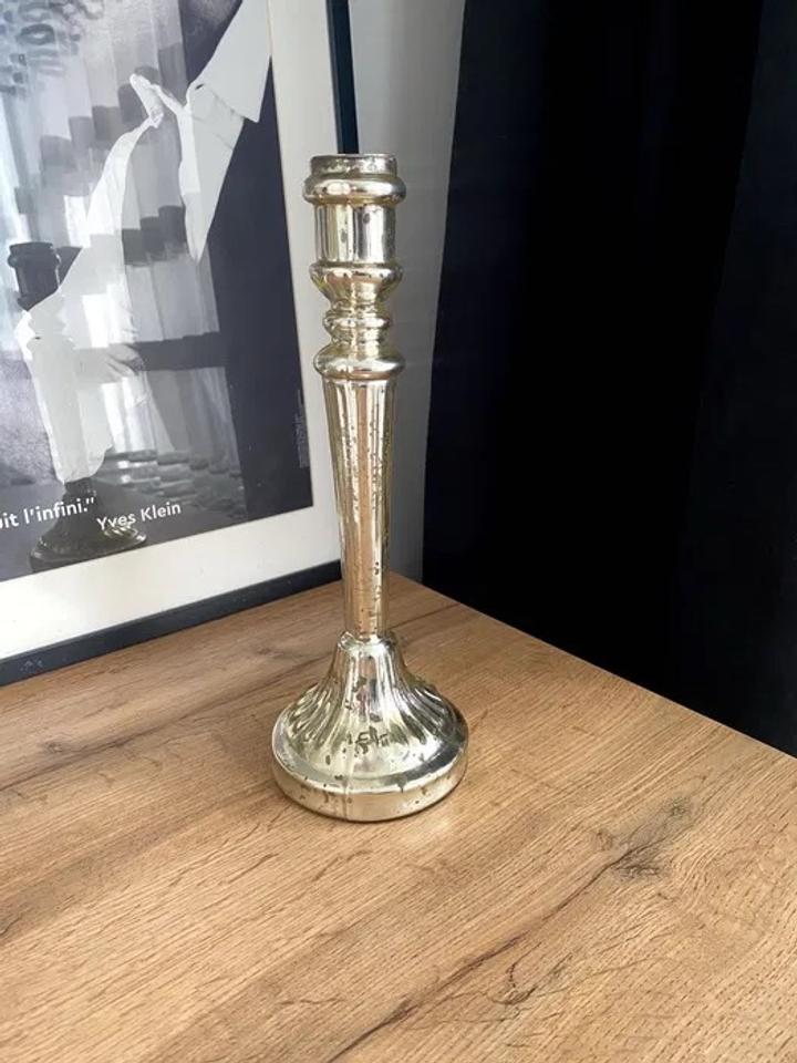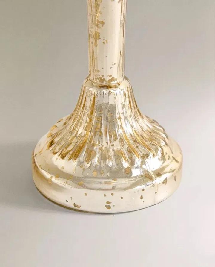 Продаю высокий стеклянный подсвечник Zara Home (Antique Christmas Glass Candlestick) — золотистое зеркальное стекло с антик-эффектом, покупался в паре, каждый за +7### ### ## ##с золотистым зеркальным покрытием внутри (mercury/antique эффект, пузырьки и блеск) - Форма: классическая рифлёная ножка + держатель для свечи - Цвет: золотистый/зеркальный Артикул: 483754