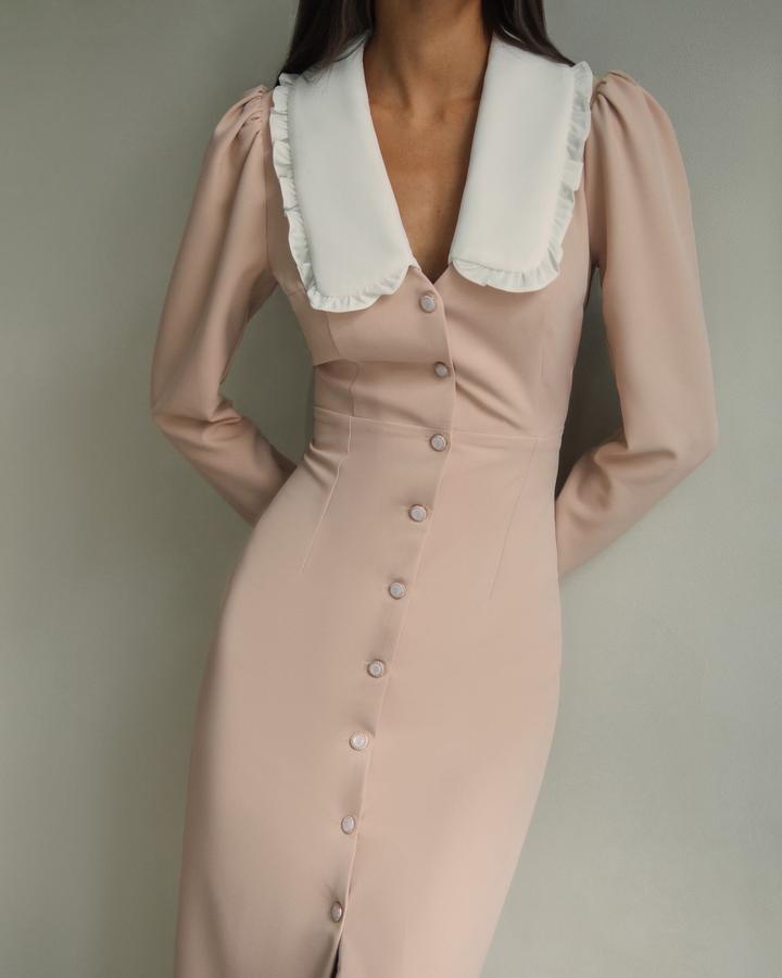 Платье, макси, приталенное, пуговицы, контрастный воротник, длинный рукав,бежевый Артикул: 483855