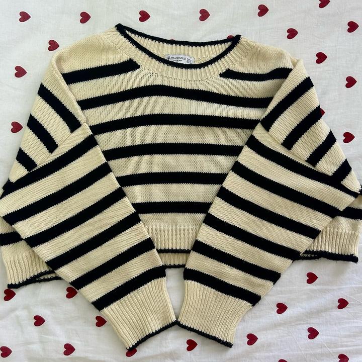 Укороченный свитер Stradivarius в бежево-желтом цвете с черными полосками, размер S. Состояние очень хорошее. Носился, но заметных следов носки нет. Идеален на весну и осень, отлично смотрится с юбками и брюками. Артикул: 484043