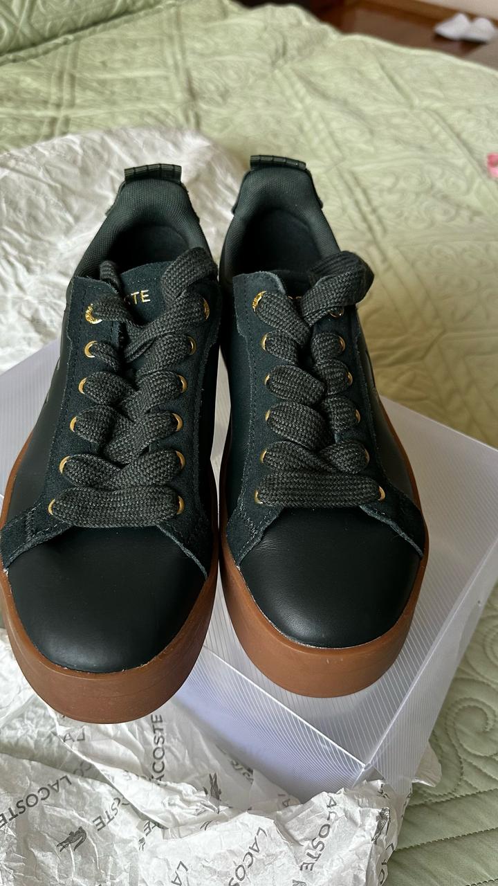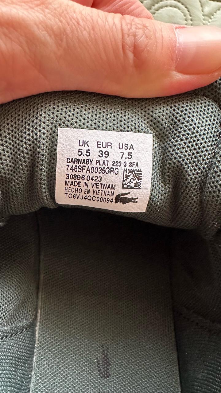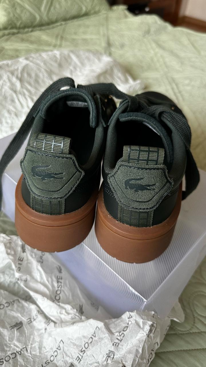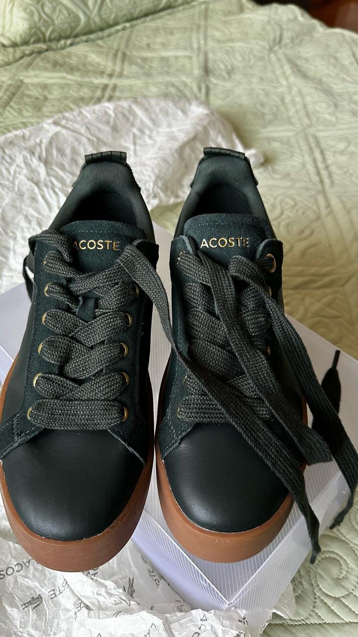 Зеленый глубокий благородный цвет. Сникерсы Lacoste. Заказывала с оригинального сайта из Америки. Чистая кожа внутри и снаружи. Литая прошитая подошва. Пришли без коробки(для меньшего веса) Носила один раз в торговый центр. Немного большеваты. Маркировка на 38 р, но реально подойдет и на 38,5 Артикул: 484099