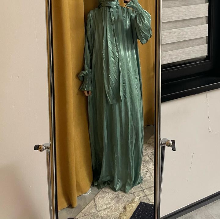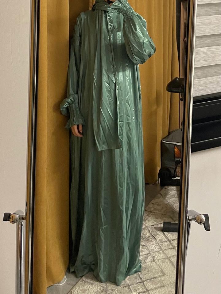 Шелковый намазник зеленого цвета, спереди имеется замок. Платок пришит. На рост 175 в пол. Надевала один раз. Состоянее нового Артикул: 484702