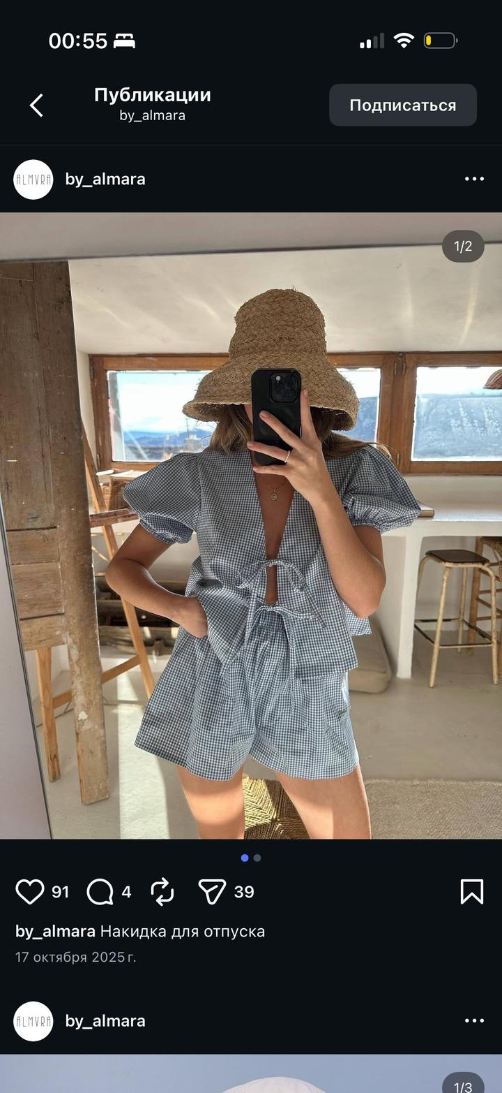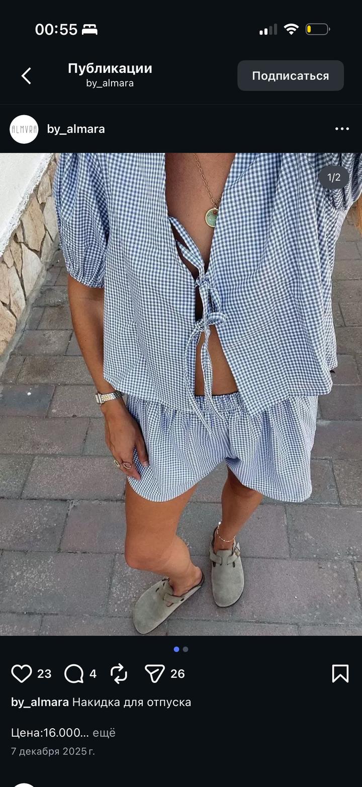 Шорты и рубашка , мелкая клетка , в бело- голубом цвете на xs-s. Для невысоких девушек . На отдых отличный вариант. В носке не был! Куплен без примерки, оказался мал. Бирок нет ( куплен в шоуруме, был в пакете прозрачном с накленным ценником , выкинула). Артикул: 485029