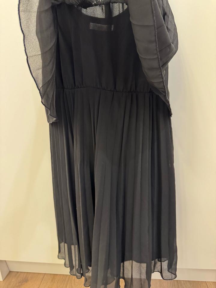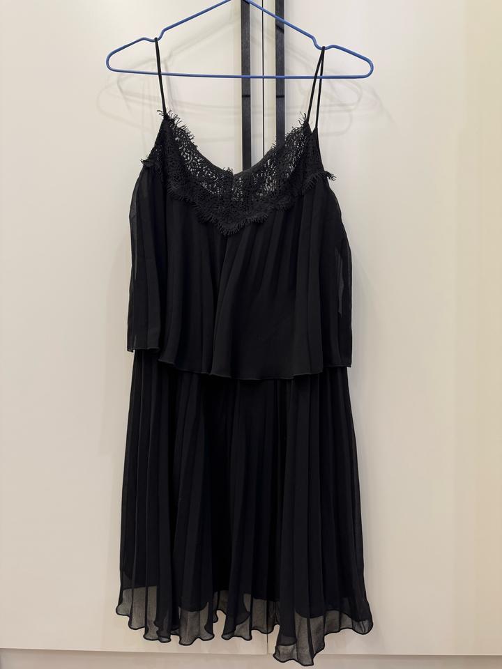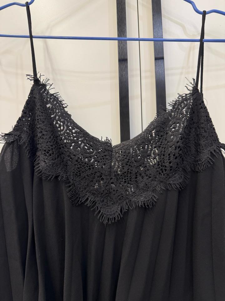 Элегантное плиссированное платье Mango чёрного цвета на тонких бретелях. Верх украшен красивым кружевом, юбка лёгкая и воздушная Артикул: 485112