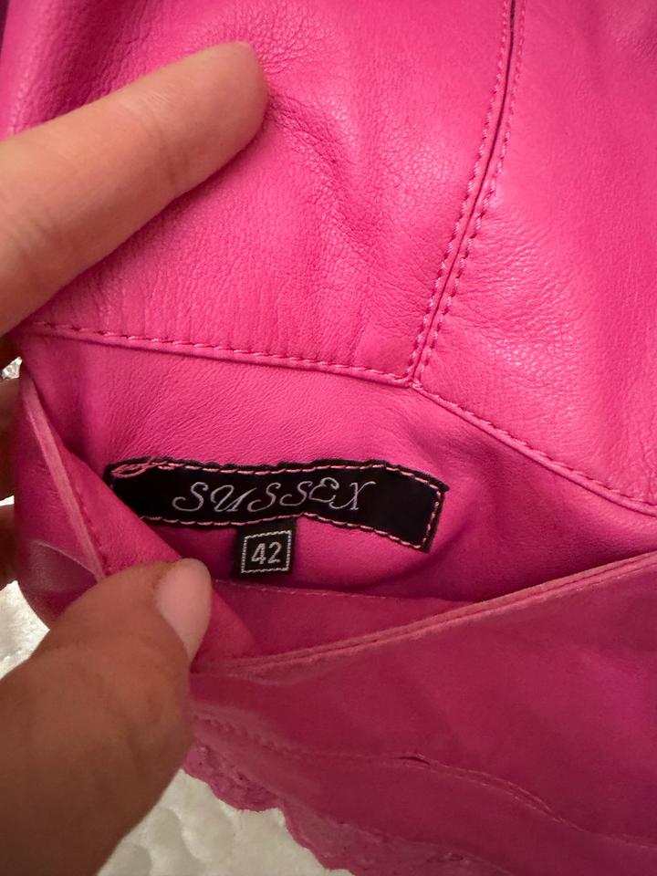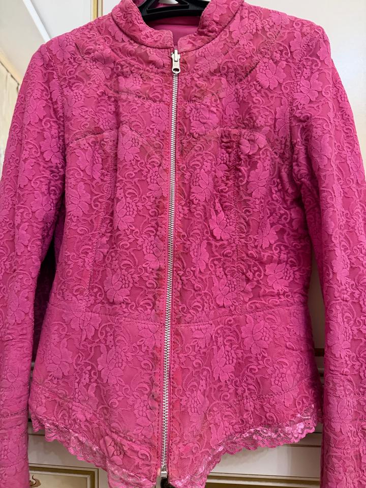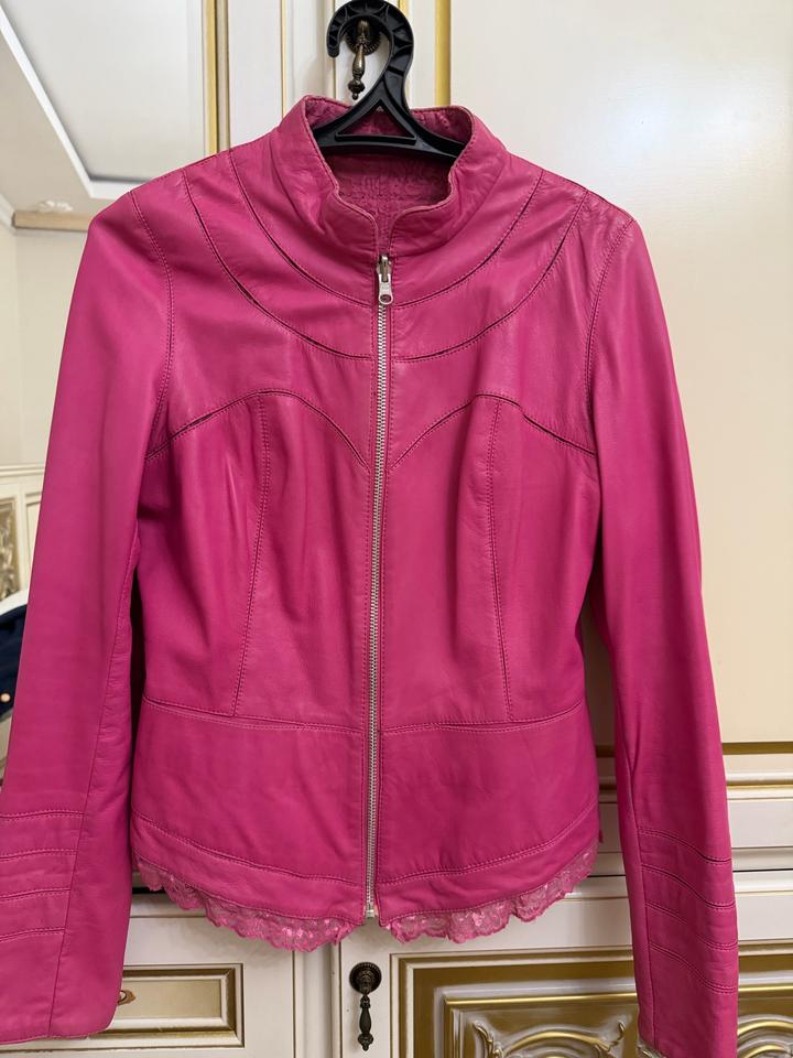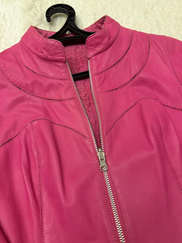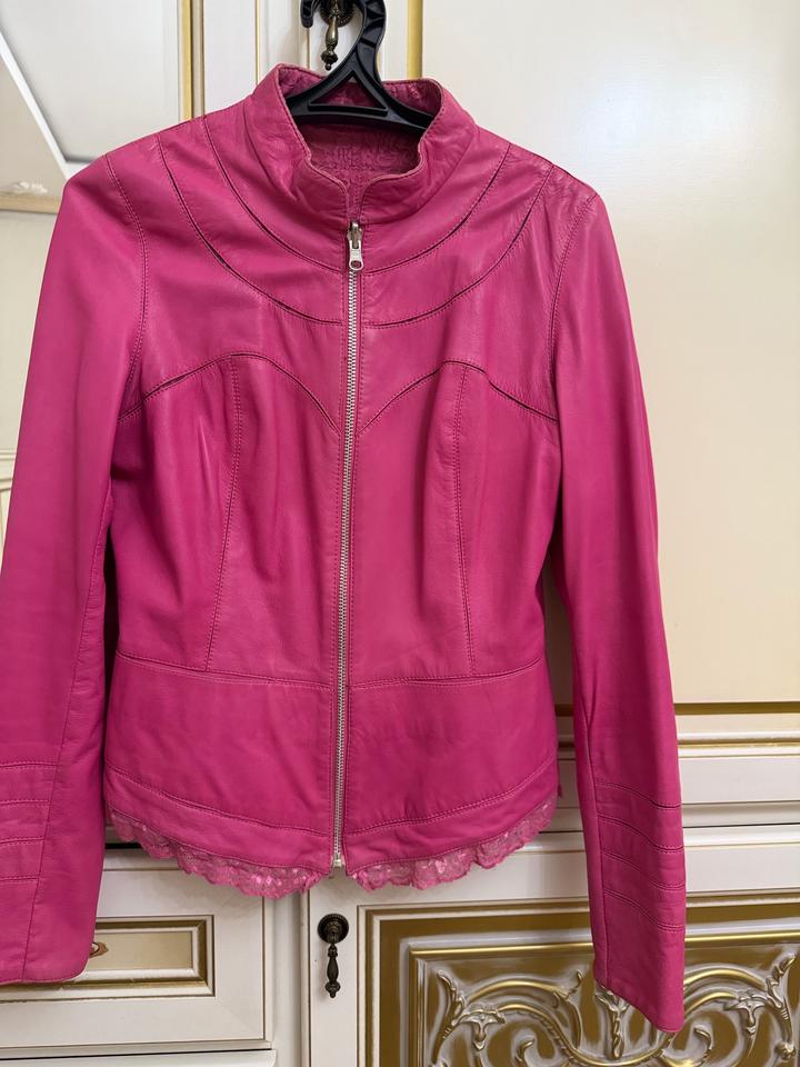 Кожана куртка розового цвета ( Барби) двусторонняя , внутри кружевная очень хорошего качества , состояние отличное . Стала мала . Носила пару раз на мероприятия . Размер 42 Артикул: 485123