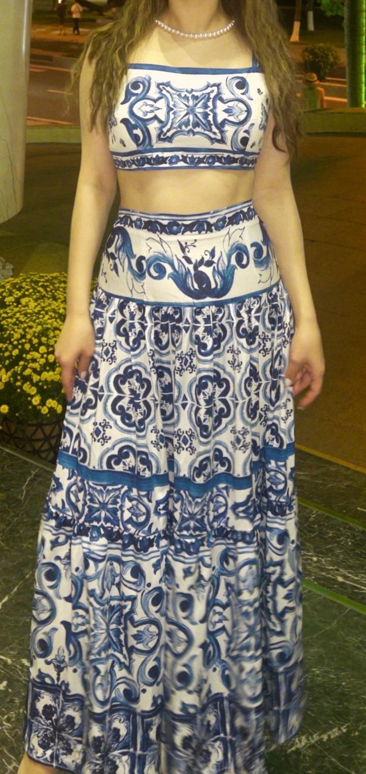 Стильный женский комплект из двух предметов: укороченный топ и юбка миди в бело-синей цветовой гамме с изысканным орнаментальным принтом в стиле керамической плитки. Топ с прямым вырезом аккуратно сидит по фигуре, а юбка с высокой талией и расклешённым силуэтом красиво подчёркивает талию и создаёт лёгкий, женственный образ. Ткань приятная к телу и хорошо держит форму. Комплект отлично подойдёт для прогулок, отдыха, летних мероприятий или фотосессий и легко сочетается как с сандалиями и босоножка Артикул: 485186