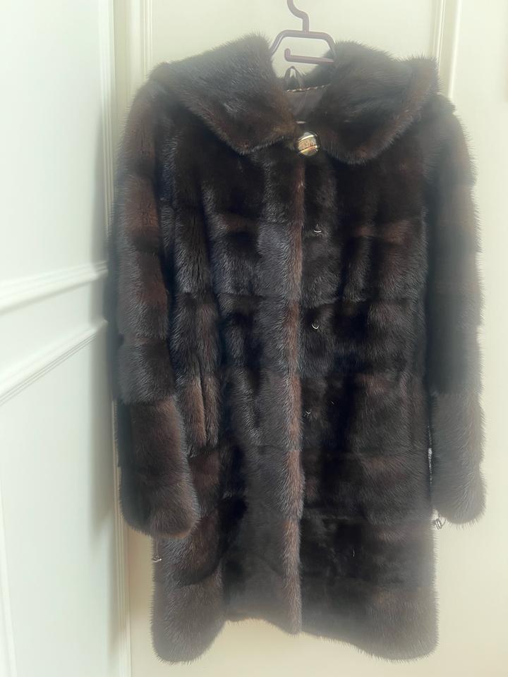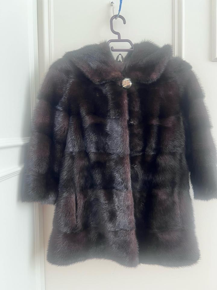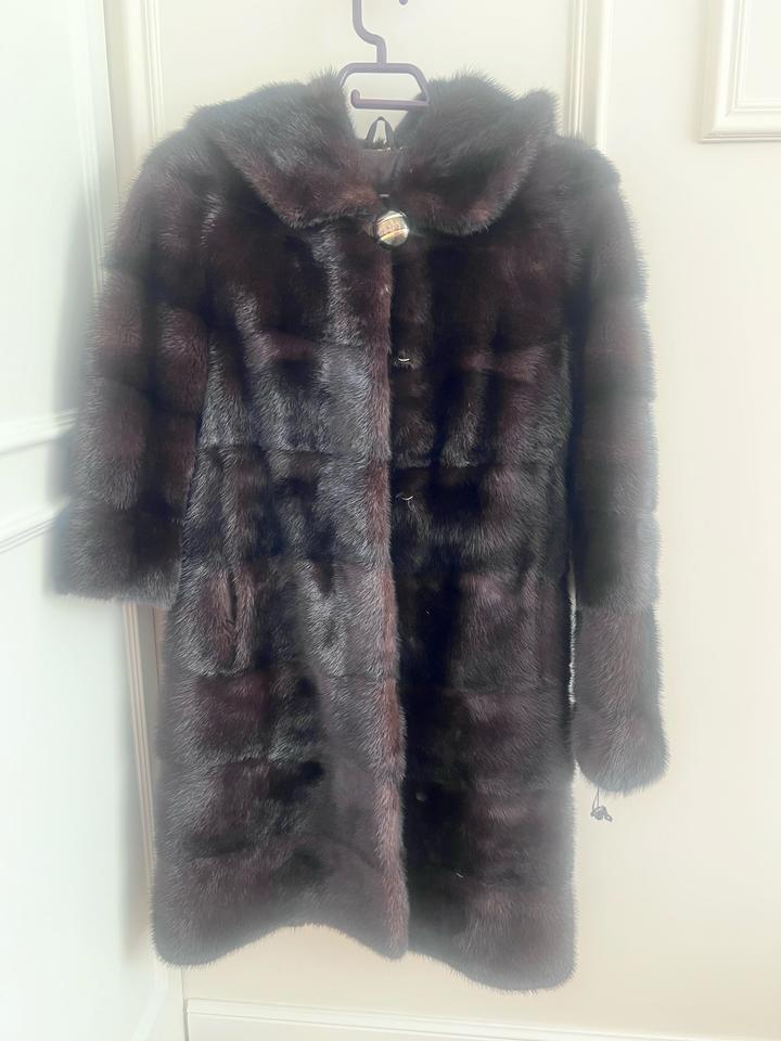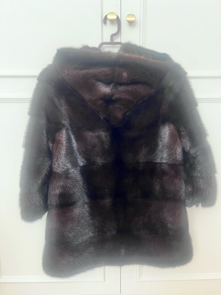 Цвет махагон, очень качественный щуба, размер 42-44. С капюшоном. Артикул: 485310