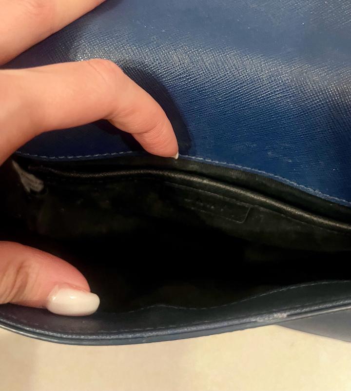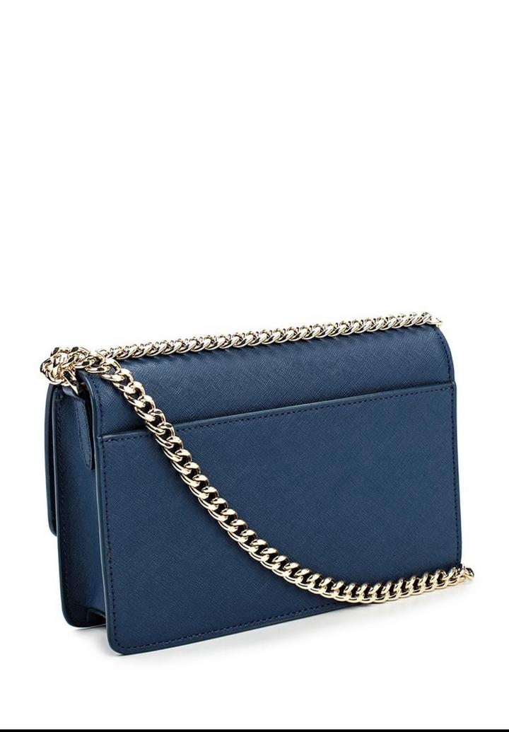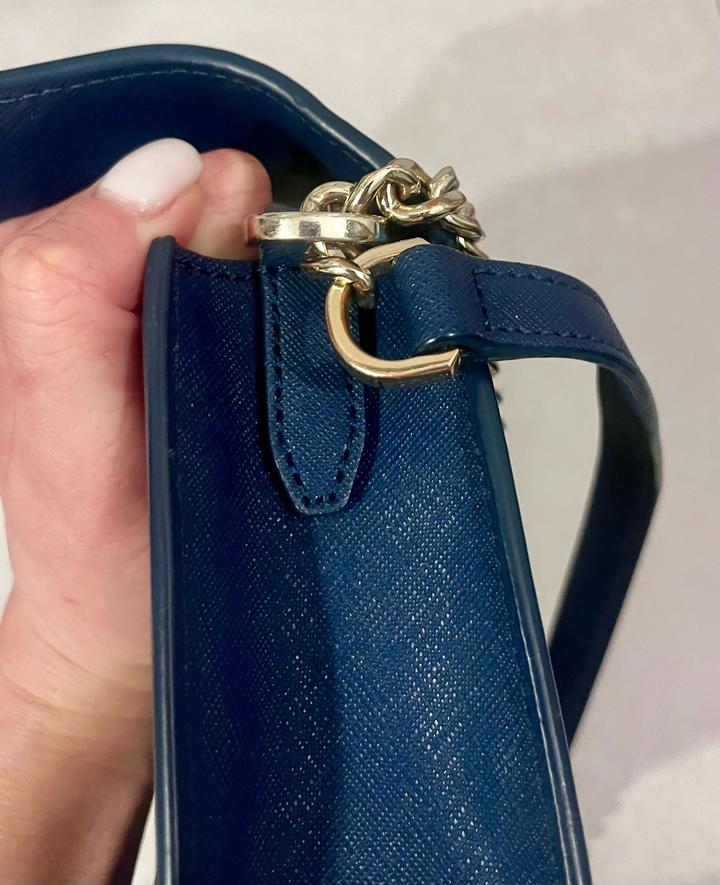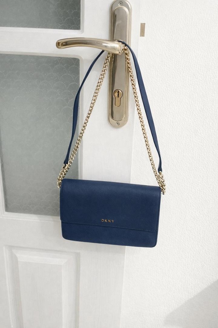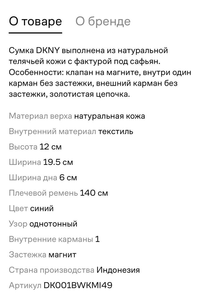 Покупала на Lamoda за 83 000 тг, подтверждение покупки есть на фото. В комплекте пыльник. Состояние очень хорошее: кожа без потертостей, фурнитура в идеале. Внутри черная текстильная подкладка, поэтому следов носки практически не видно. Лаконичная модель в глубоком синем цвете с аккуратным логотипом DKNY и цепочкой благородного светлого золота. Очень универсальная сумочка: подходит и на каждый день, и как аккуратный акцент к более нарядному образу. Небольшая, но вместительная. Артикул: 485346