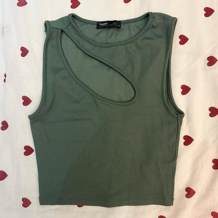Зеленый топ с вырезом Pull&Bear, размер S. Состояние очень хорошее, никаких дефектов нет. Сидит удобно, не стягивает. Идеально на лето или танцы. Артикул: 485468