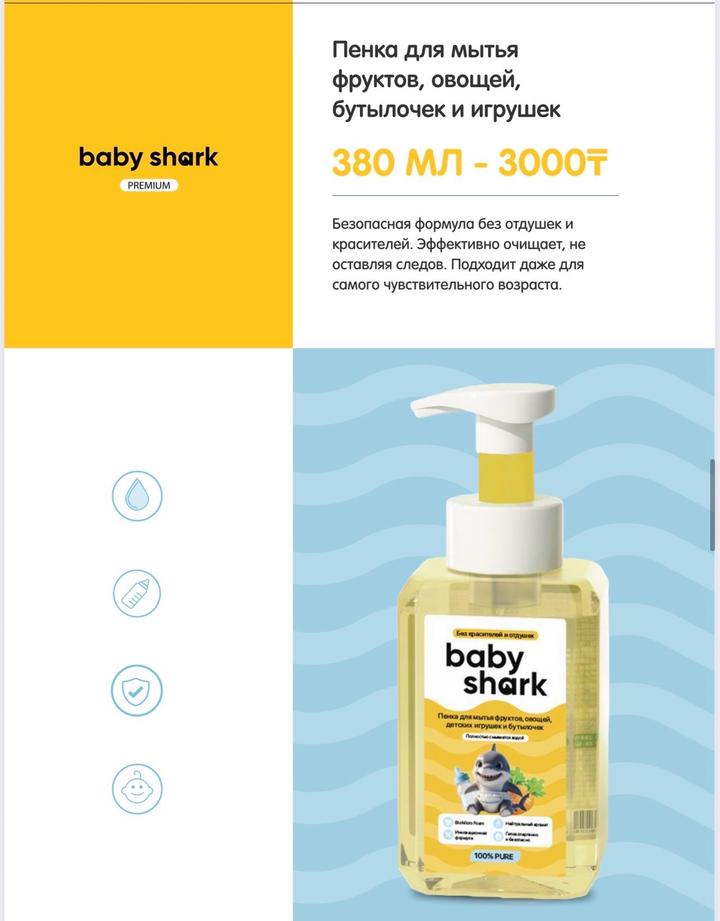 Пенка для мытья посуды, овощей и фруктов , сосок , бутылочек , не оставляет резкого запаха после мытья, гипоаллергенный состав от бренда Babyshark Артикул: 485510
