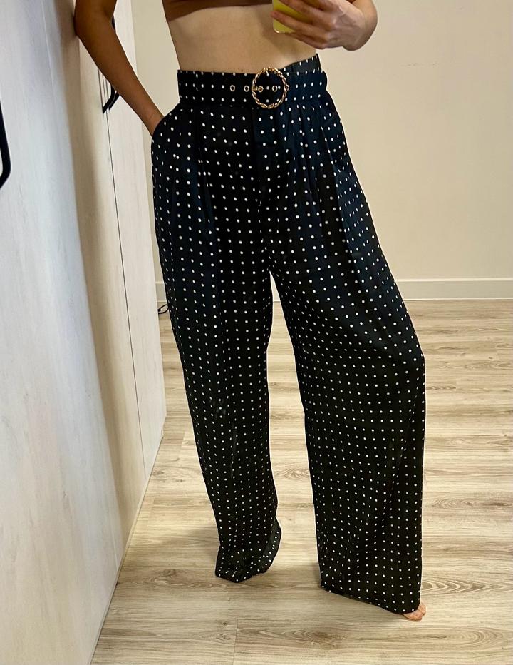 Атласные широкие брюки черного цвета в белый горошек. В комплекте широкий пояс из той же ткани Артикул: 485560