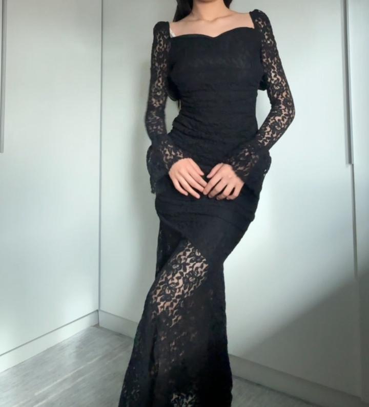 Чёрное кружевное макси платье надевала всего один раз, состояние супер, как новое! Вырез V образный, рукава длинные прозрачные с колокольчиками, юбка русалкой. Низ прозрачный с кружевом только ниже бедер, сама ткань чёрная плотная до бёдер, дальше видно ноги через кружево, но подкладка есть, не совсем голо Размер S Длина 150 см Без пятен, зацепок Продаю, потому что слишком нарядное, висит без дела и я его больше не надену Артикул: 485610