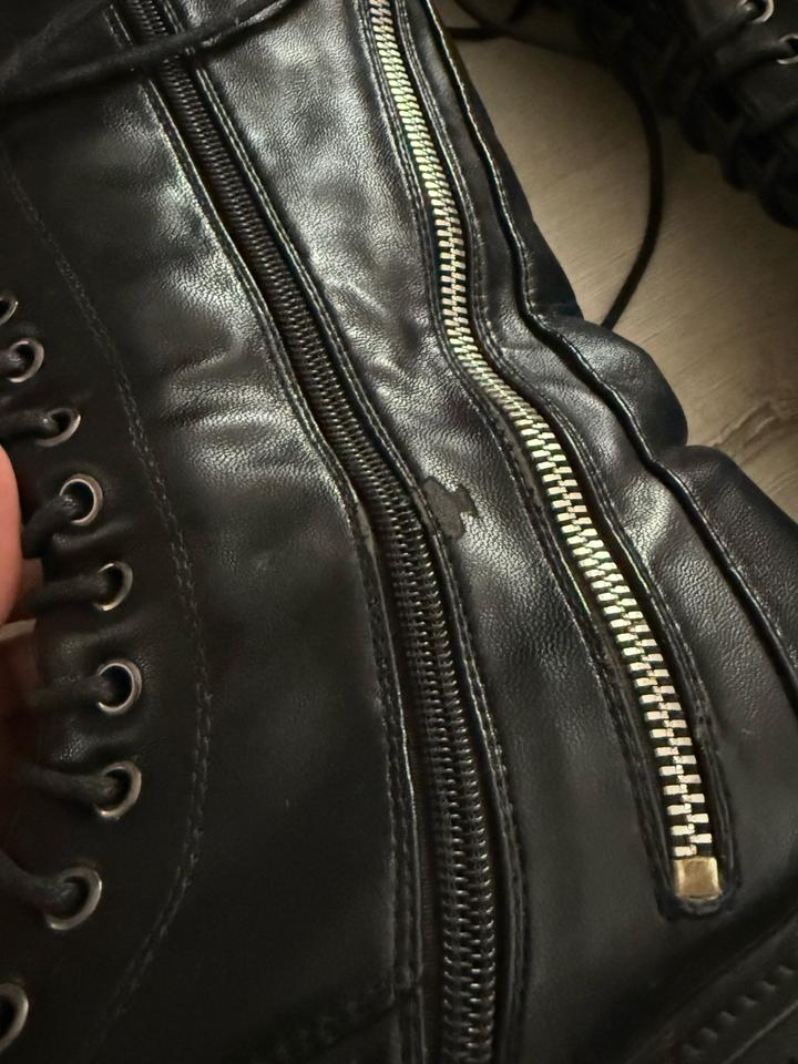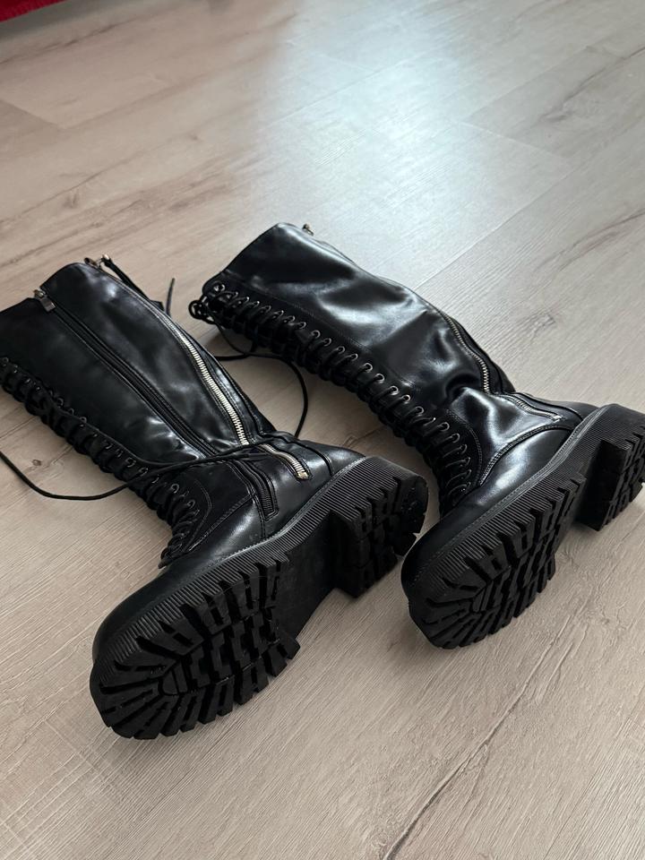 Высокие зимние сапоги на меху с декоративной молнией и шнуровкой Есть потёртость на правом сапоге внизу. Размер: 38, подойдут на широкую ногу Артикул: 485710