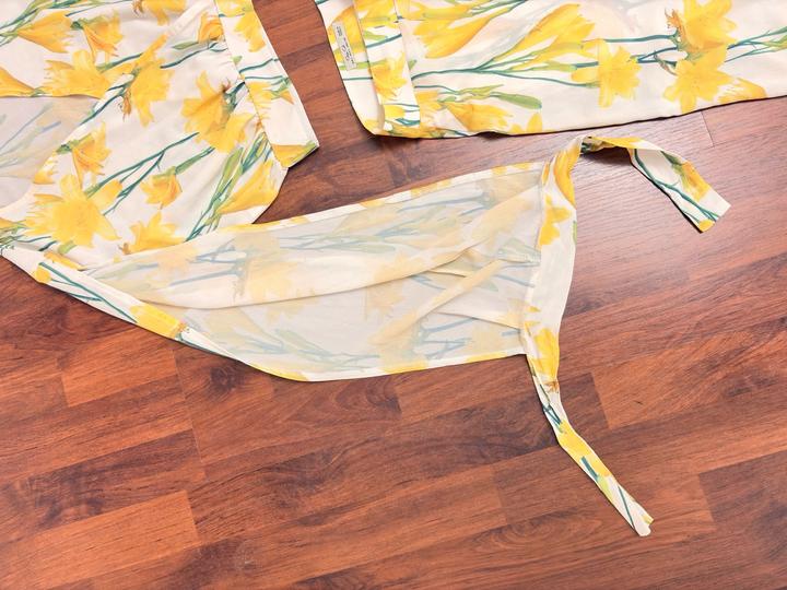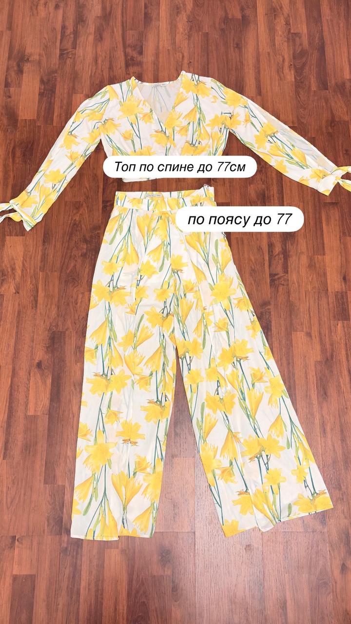 Лёгкий комплект из полупрозрачной приятной к телу ткани (шифон): укороченный топ с длинными рукавами и широкие брюки-палаццо с высокой посадкой. Принт цветочный 2025/26 года Топ: завязки на запястьях, рукава с аккуратными вырезами, деликатно скрывают зону рук. Брюки: с разрезами, при ходьбе видна только передняя часть ног. Вшитые шортики — ничего не просвечивает. Брюки по талии +7### ### ## ##см Состояние: без дефектов и следов носки. Надевался 1 раз. Артикул: 485864